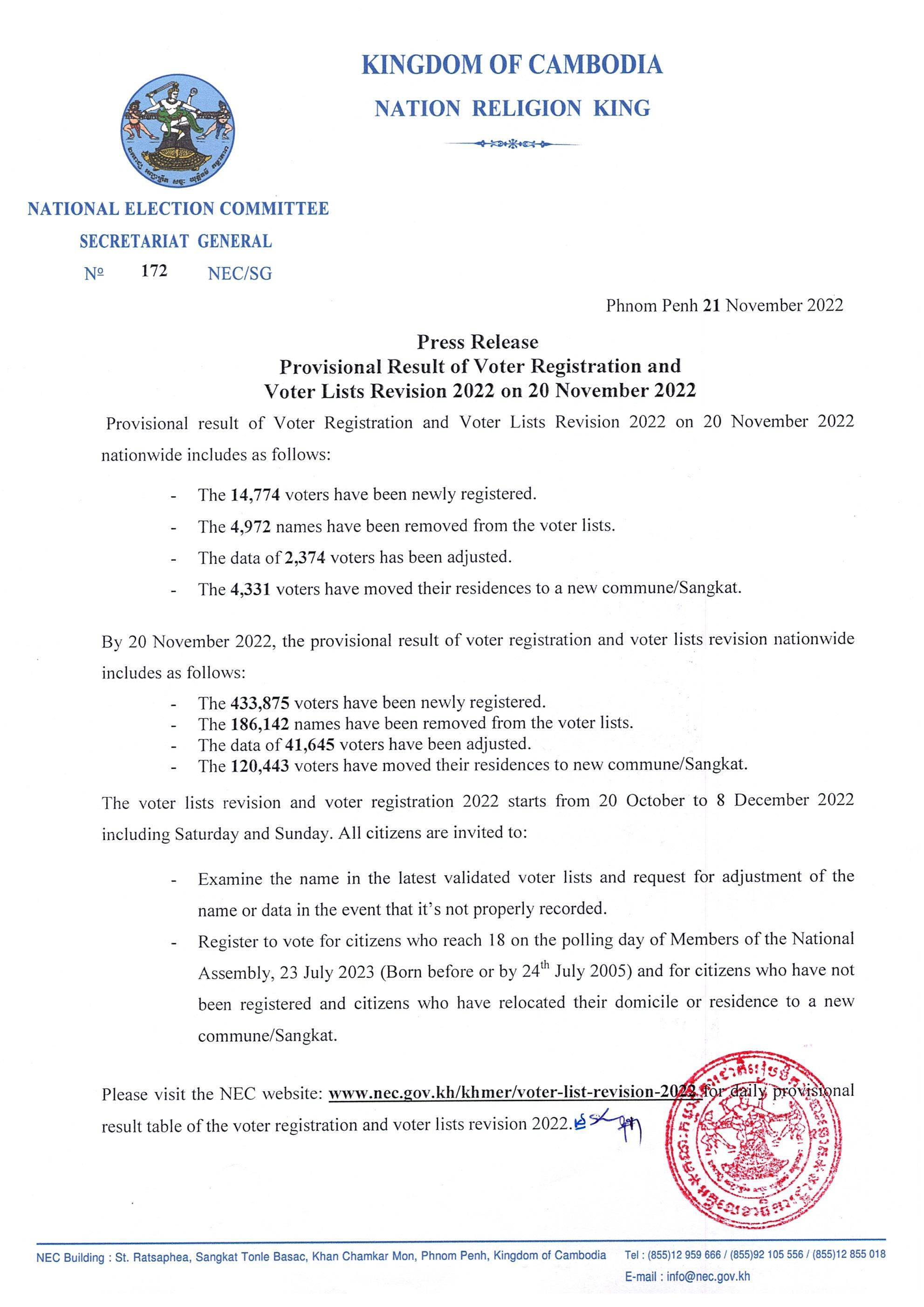 Press Release : Provisional Result of Voter Registration and Voter Lists Revision 2022 on 20 November 2022