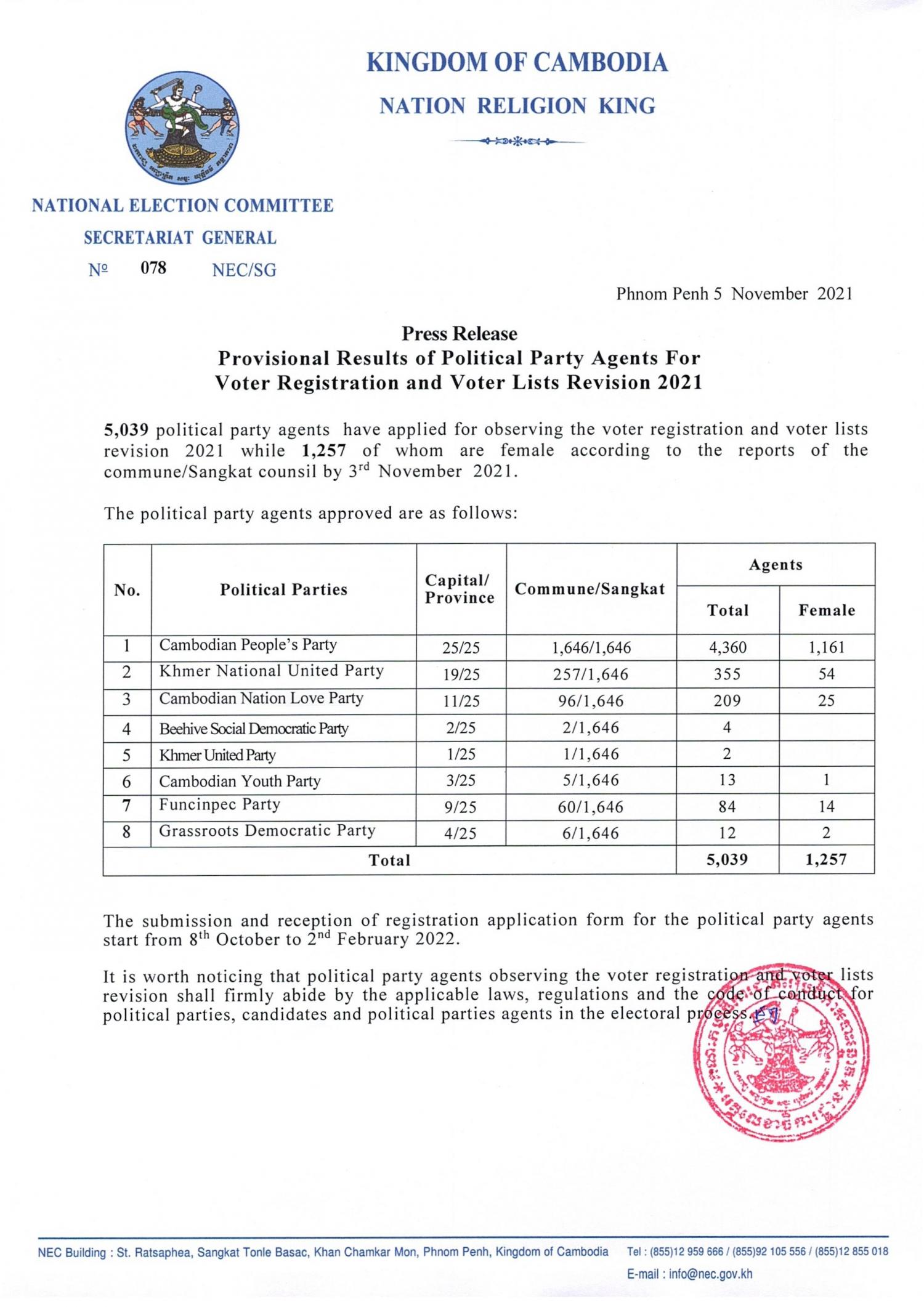 Press Release : Provisional Results of Political Party agents For Voter Registration and Voter Lists Revision 2021