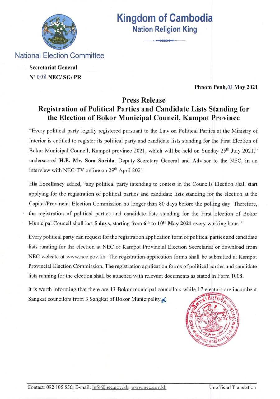 “Every political party legally registered pursuant to the Law on Political Parties at the Ministry of Interior is entitled to register its political party and candidate lists standing for the First Election of Bokor Municipal Council, Kampot province 2021, which will be held on Sunday 25th July 2021,” underscored H.E. Mr. Som Sorida, Deputy-Secretary General and Advisor to the NEC, in an interview with NEC-TV online on 29th April 2021.