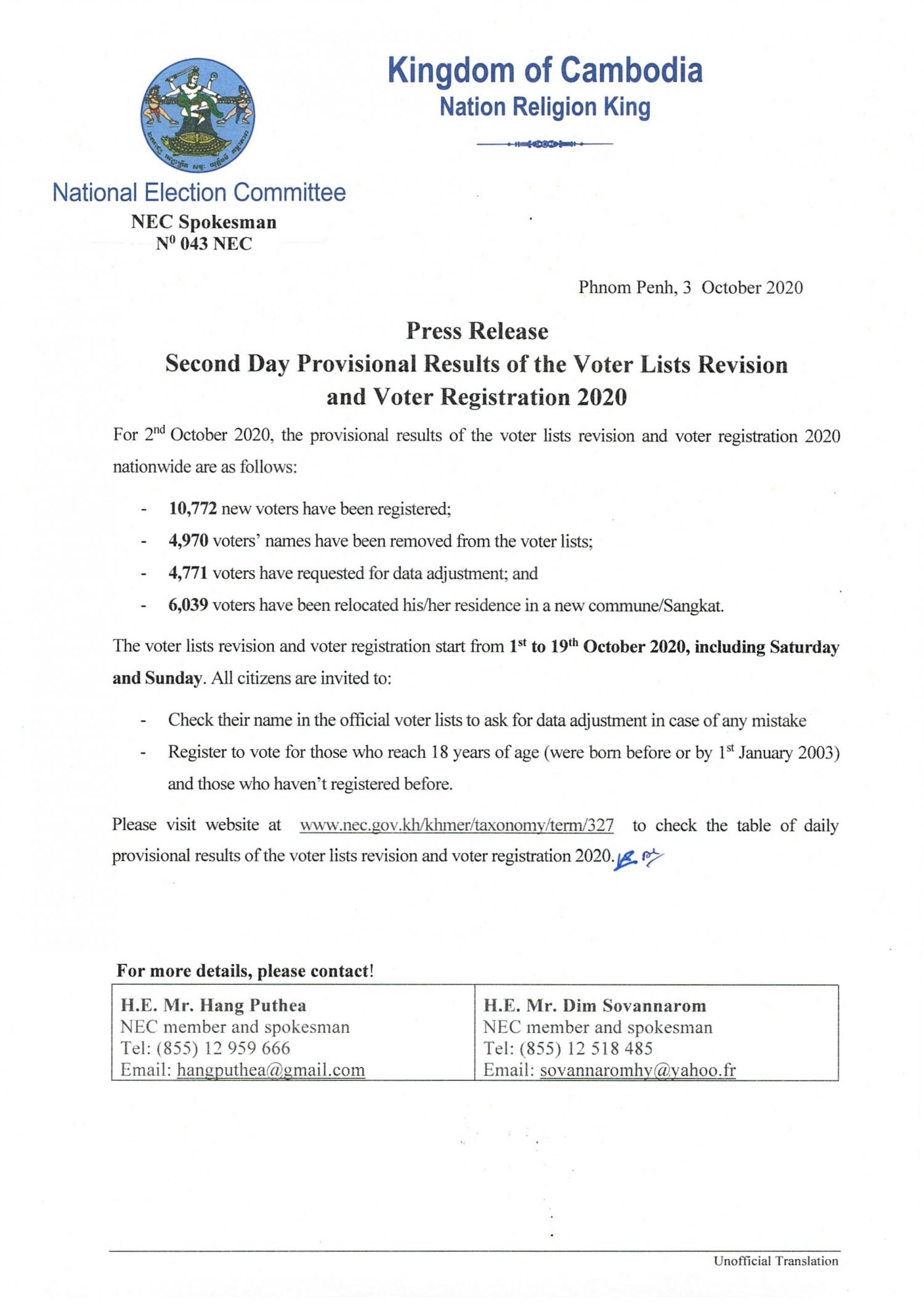 Press Release : Second Day Provisional Results of the Voter Lists Revision and Voter Registration 2020