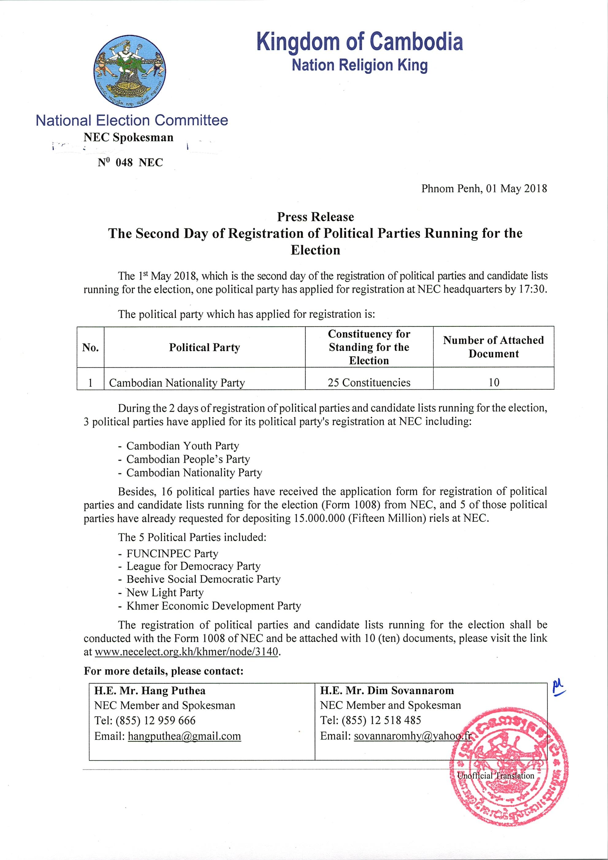 Press Release : The Second Day of Registration of Political Parties Running For the Election
