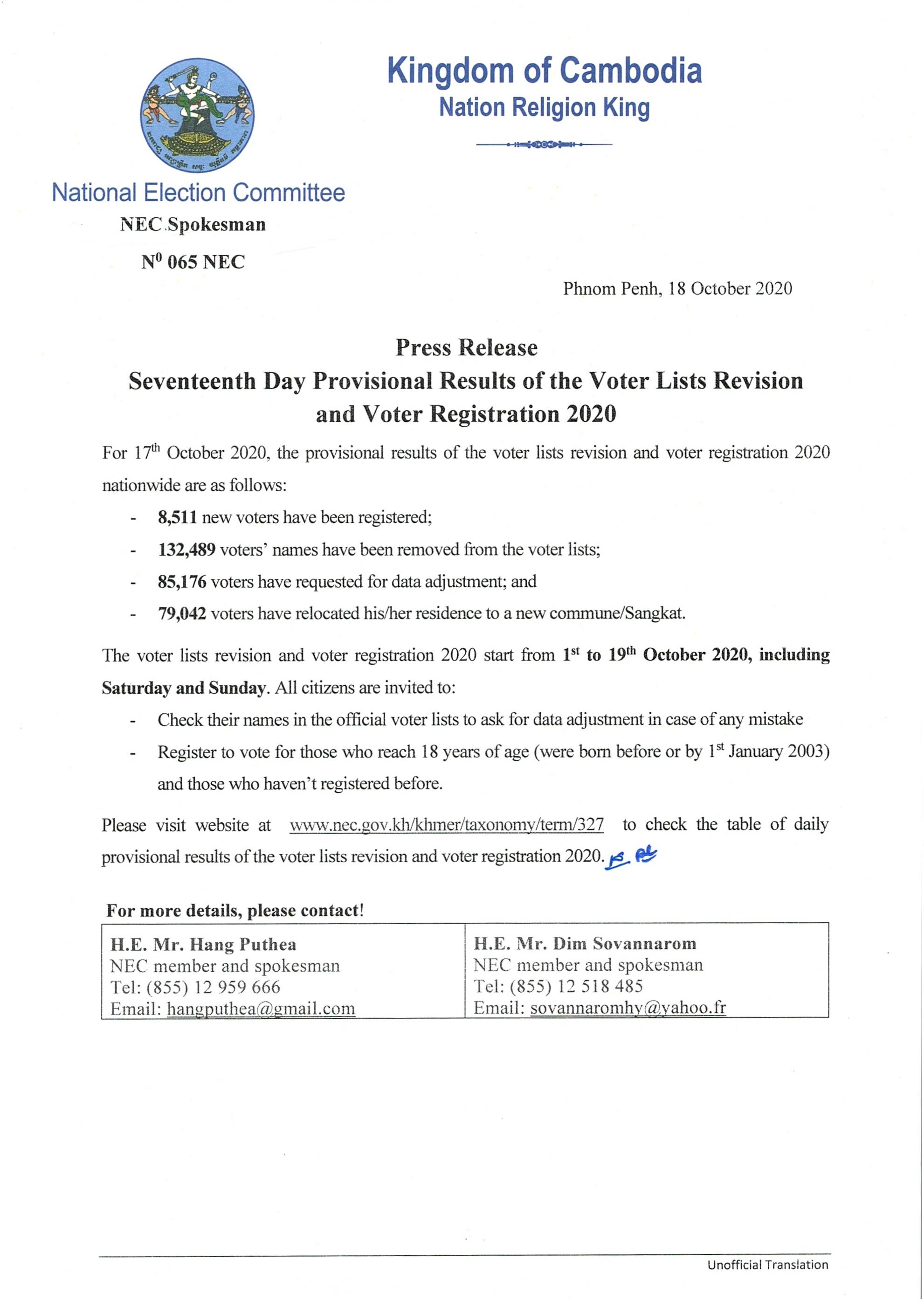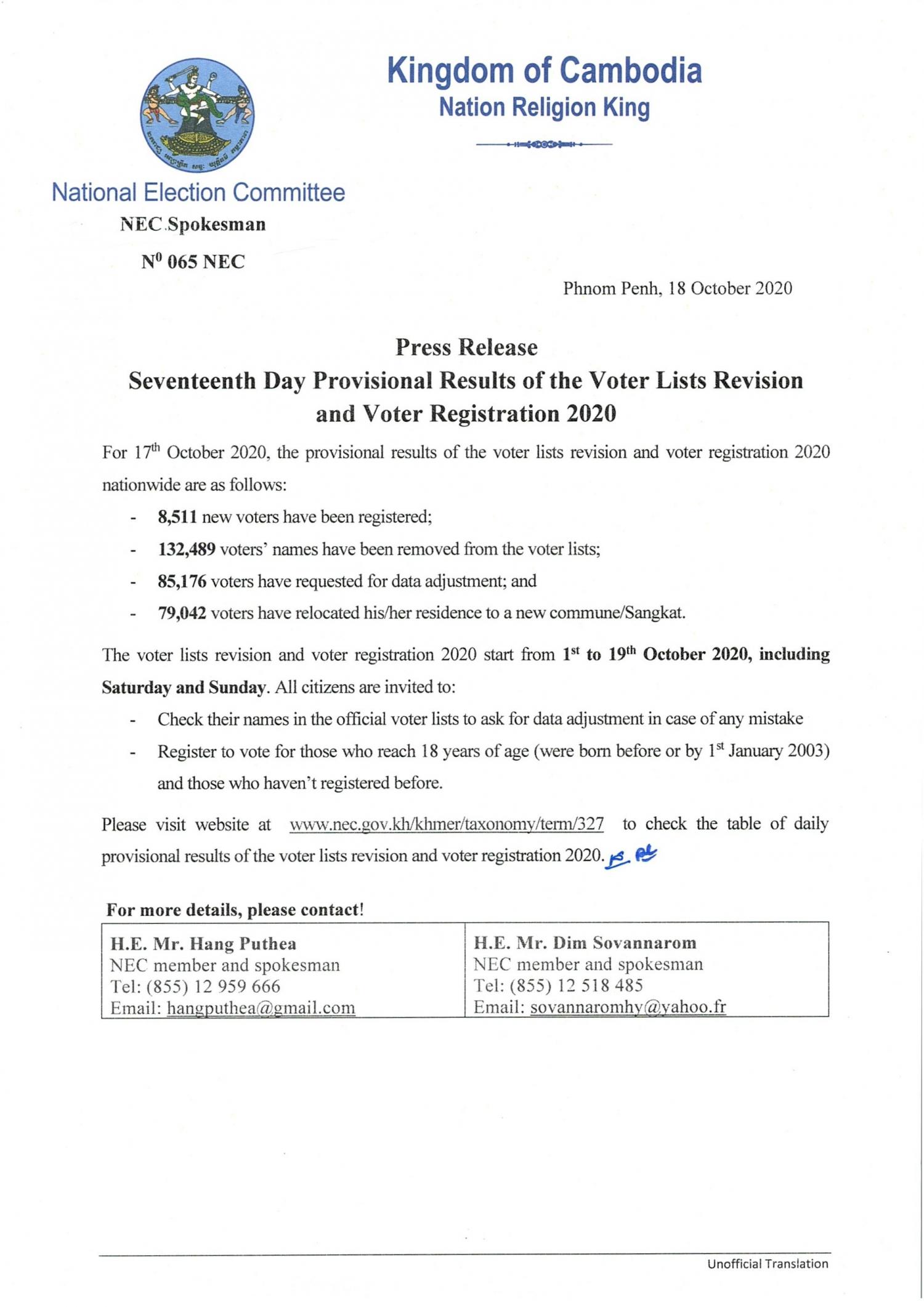 Press Release : Seventeenth Day Provisional Results of the Voter Lists Revision and Voter Registration 2020