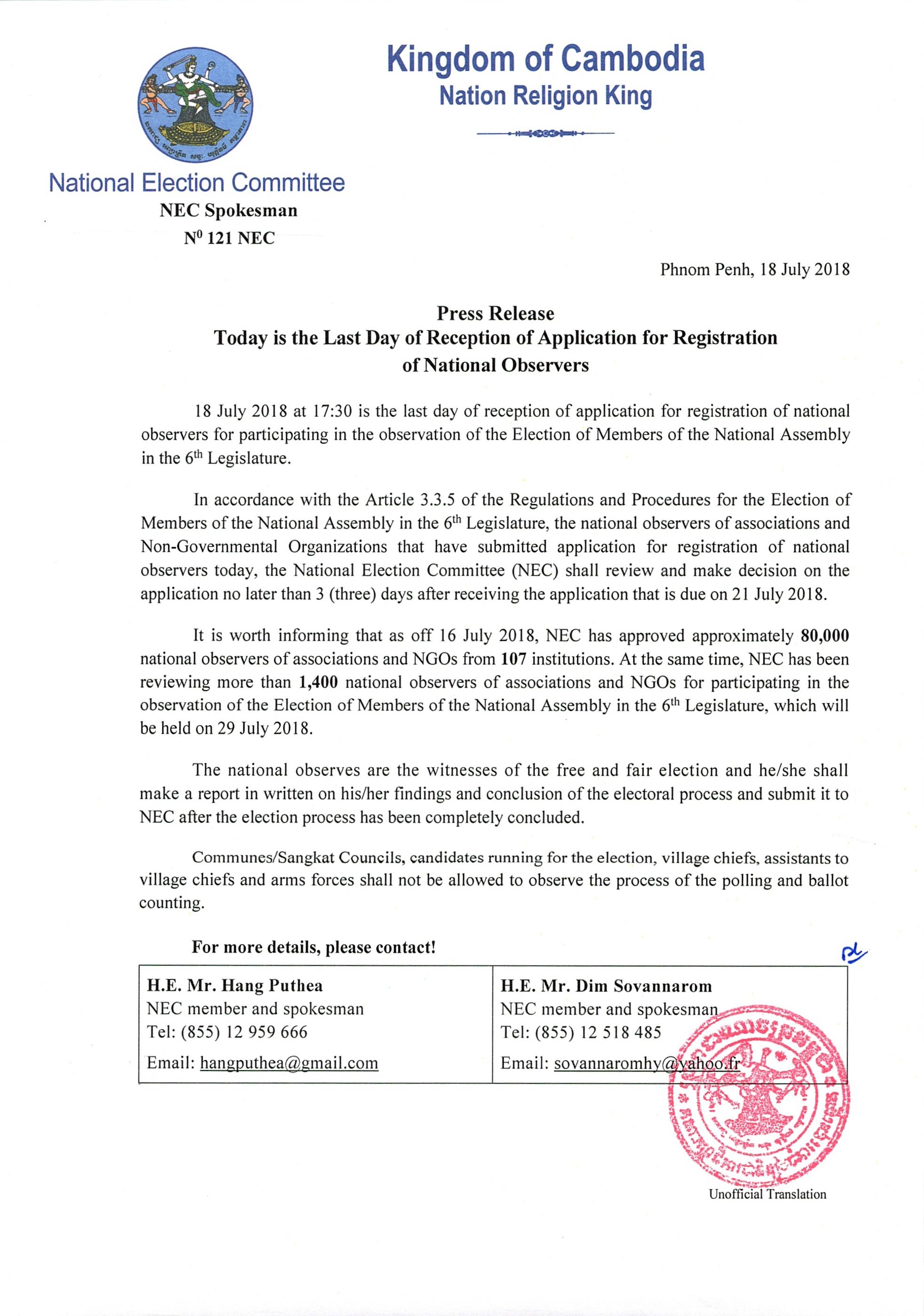 Press Release: Today is the Last Day of Reception of Application for Registration of National Observers