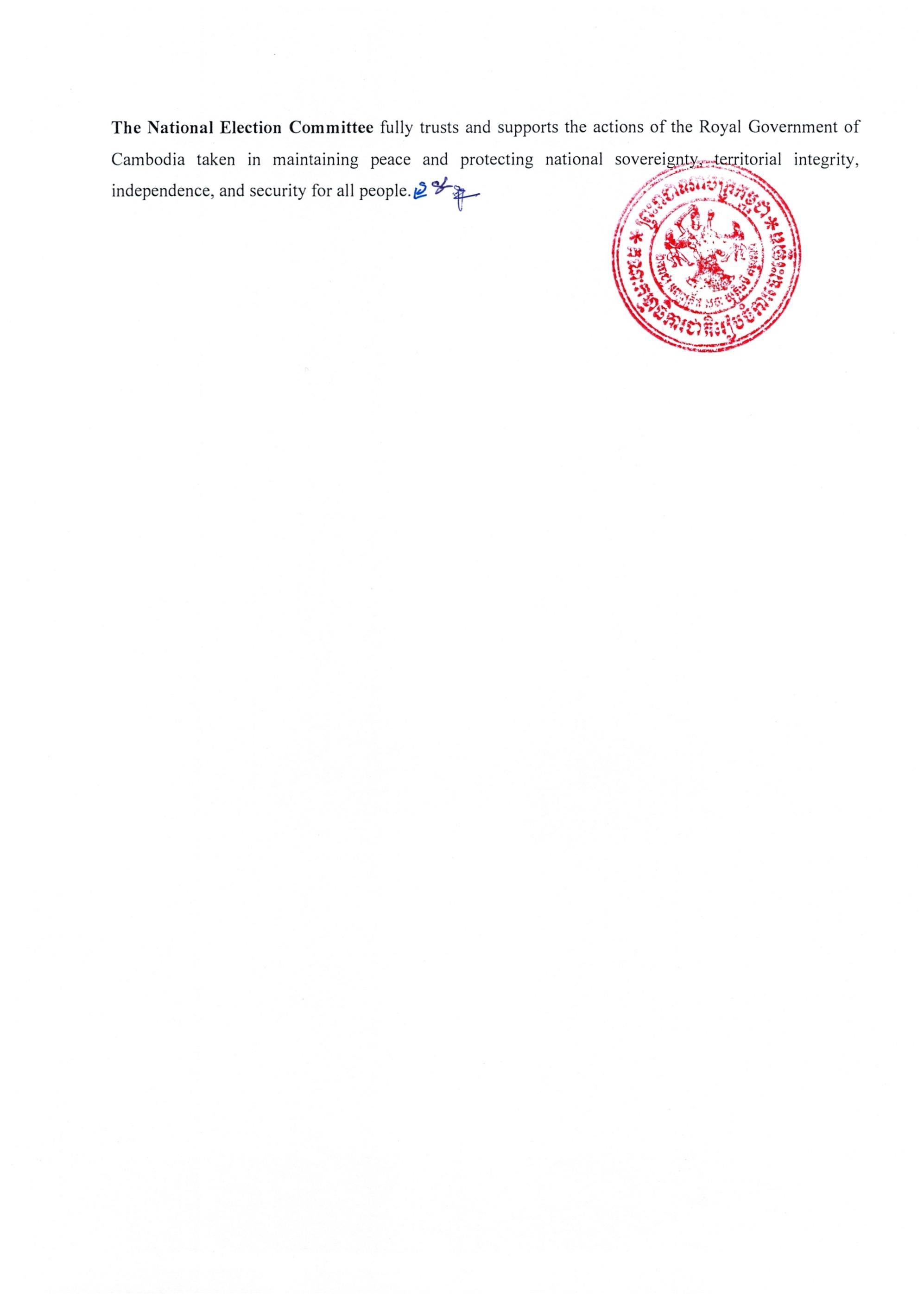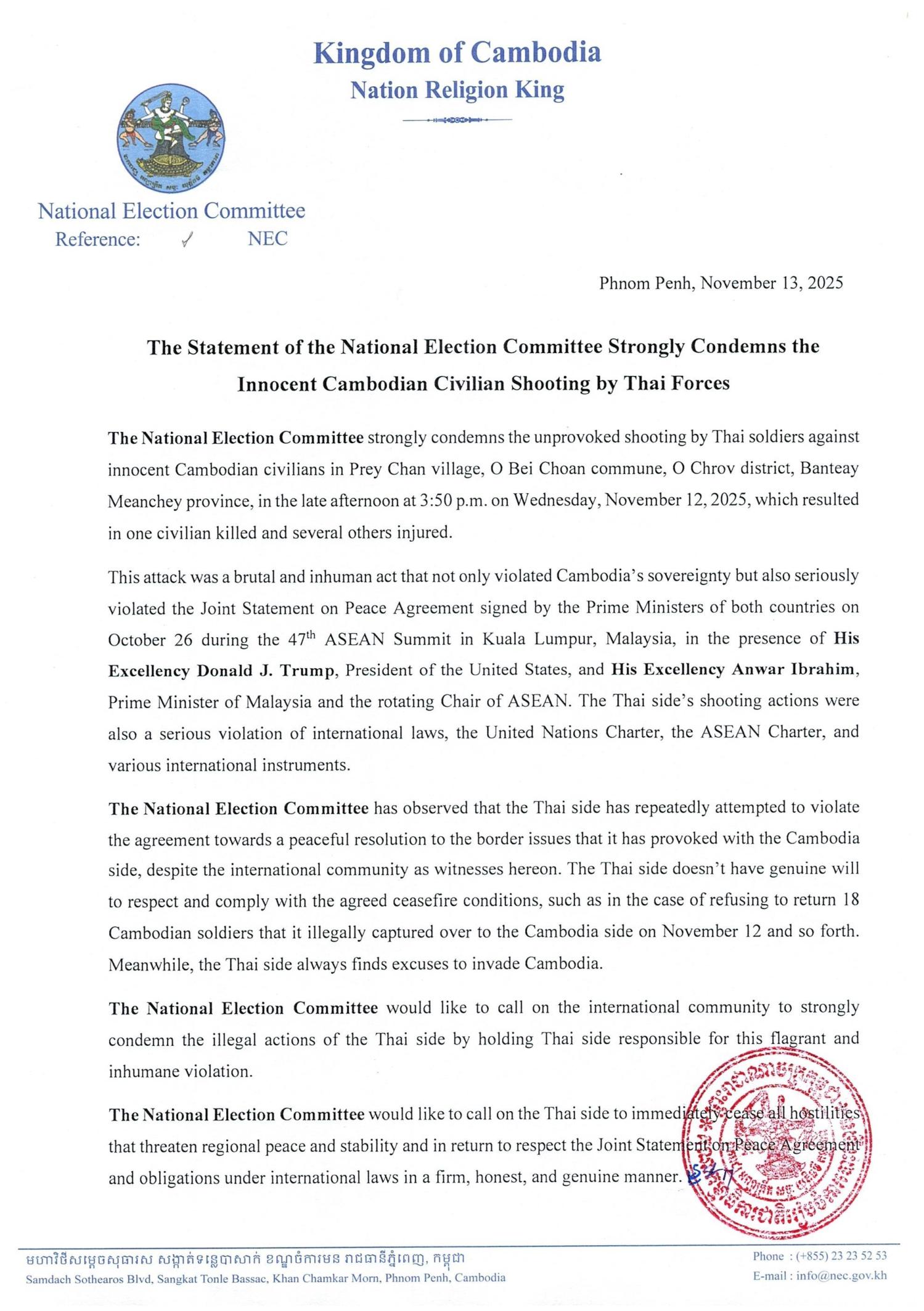 The Statement of the National Election Committee Strongly Condemns the Innocent Cambodian Civilian Shooting by Thai Forces