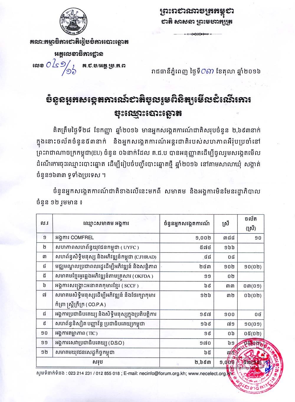 ចំនួនអ្នកសង្កេតការណ៍ជាតិចូលរួមពិនិត្យមើលដំណើរការចុះឈ្មោះបោះឆ្នោត គិតត្រឹមថ្ងៃទី២៨ ខែកញ្ញា ឆ្នាំ២០១៦