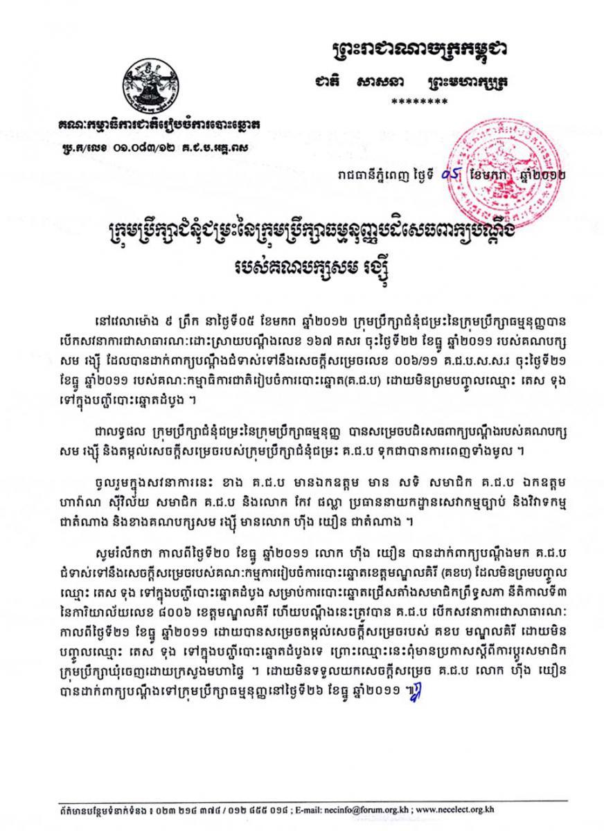 ក្រុមប្រឹក្សាជំនុំជម្រះនៃក្រុមប្រឹក្សាធម្មនុញ្ញបដិសេធពាក្យបណ្តឹងរបស់គណបក្សសម រង្ស៊ី