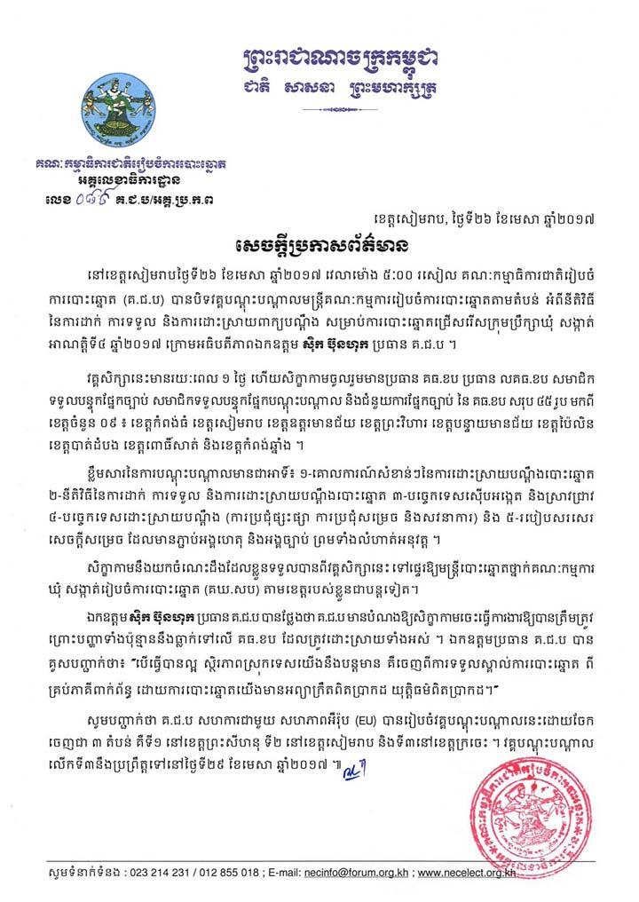 នៅខេត្តសៀមរាបថ្ងៃទី២៦ ខែមេសា ឆ្នាំ២០១៧ វេលាម៉ោង ៥:០០ រសៀល គណៈកម្មាធិការជាតិរៀបចំការបោះឆ្នោត (គ.ជ.ប) បានបិទវគ្គបណ្ដុះបណ្ដាលមន្ត្រីគណៈកម្មការរៀបចំការបោះឆ្នោតតាមតំបន់ អំពីនីតិវិធីនៃការដាក់ ការទទួល និងការដោះស្រាយពាក្យបណ្ដឹង សម្រាប់ការបោះឆ្នោតជ្រើសរើសក្រុមប្រឹក្សាឃុំ សង្កាត់ អាណត្តិទី៤ ឆ្នាំ២០១៧ ក្រោមអធិបតីភាពឯកឧត្តម ស៊ិក ប៊ុនហុក ប្រធាន គ.ជ.ប ។