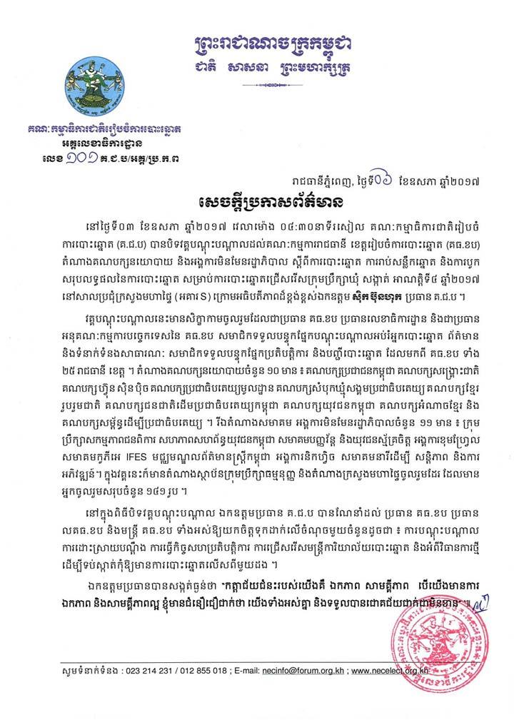 នៅថ្ងៃទី០៣ ខែឧសភា ឆ្នាំ២០១៧ វេលាម៉ោង ០៤:៣០នាទីរសៀល គណៈកម្មាធិការជាតិរៀបចំ ការបោះឆ្នោត (គ.ជ.ប) បានបិទវគ្គបណ្តុះបណ្តាលដល់គណៈកម្មការរាជធានី ខេត្តរៀបចំការបោះឆ្នោត (គធ.ខប) តំណាងគណបក្សនយោបាយ និងអង្គការមិនមែនរដ្ឋាភិបាល ស្តីពីការបោះឆ្នោត ការរាប់សន្លឹកឆ្នោត និងការបូកសរុបលទ្ធផលនៃការបោះឆ្នោត សម្រាប់ការបោះឆ្នោតជ្រើសរើសក្រុមប្រឹក្សាឃុំ សង្កាត់ អាណតិ្តទី៤ ឆ្នាំ២០១៧ នៅសាលប្រជុំក្រសួងមហាផ្ទៃ ( អគារ S ) ក្រោមអធិបតីភាពដ៏ខ្ពង់ខ្ពស់ឯកឧត្តម ស៊ិក ប៊ុនហុក ប្រធាន គ.ជ.ប ។