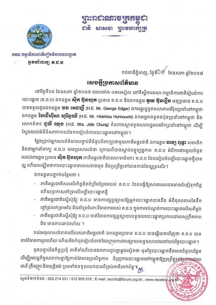 នៅថ្ងៃទី០៨ ខែឧសភា ឆ្នាំ២០១៧ វេលាម៉ោង ០៣រសៀល នៅទីស្តីការគណៈកម្មាធិការជាតិរៀបចំការបោះឆ្នោត (គ.ជ.ប) ឯកឧត្តម ស៊ិក ប៊ុនហុក ប្រធាន គ.ជ.ប និងឯកឧត្តម គួយ ប៊ុនរឿន អនុប្រធាន គ.ជ.ប បានទទួលជួបឯកឧត្តម ចច អេដហ្គឺ (H.E. Mr. George Edgar) ឯកអគ្គរដ្ឋទូតសហភាពអឺរ៉ុបប្រចាំនៅកម្ពុជា ឯកឧត្តម ហៃដឺហ៊ីសា ហូរីនូឈី (H.E. Mr. Hidehisa Horinouchi) ឯកអគ្គរាជទូតជប៉ុនប្រចាំនៅកម្ពុជា និងលោកជំទាវ ជូលី ឈុង (H.E. Mrs. Jolie Chung) តំណាងស្ថានទូតសហរដ្ឋអាមេរិកប្រចាំនៅកម្ពុជា ដើម្បីស្វែងយល់អំពីដំណាក់កាលនៃការរៀបចំការបោះឆ្នោតនៅកម្ពុជា។