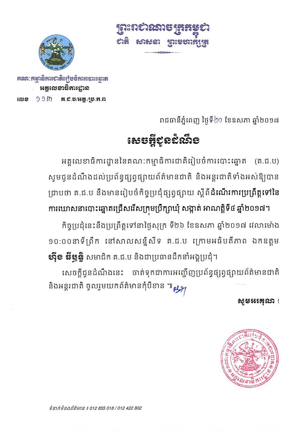 សេចក្ដីជូនដំណឹង ៖ នាព្រឹក ថ្ងៃទី២៦ ខែឧសភា ឆ្នាំ២០១៧ គ.ជ.ប នឹងមានរៀបចំកិច្ចប្រជុំផ្សព្វផ្សាយស្ដីពីដំណឹងការប្រព្រឹត្តទៅនៃការឃោសនាបោះឆ្នោតជ្រើសរើសក្រុមប្រឹក្សាឃុំ សង្កាត់ អាណត្តិទី៤ ឆ្នាំ២០១៧ នៅសាលសន្និសីទ គ.ជ.ប