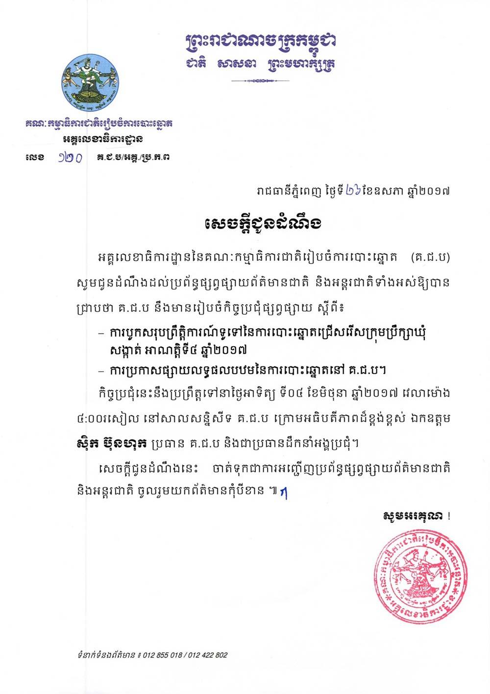 កិច្ចប្រជុំនេះនឹងប្រព្រឹត្តទៅនាថ្ងៃអាទិត្យ ទី០៤ ខែមិថុនា ឆ្នាំ២០១៧ វេលាម៉ោង ៤:០០រសៀល នៅសាលសន្និសីទ គ.ជ.ប ក្រោមអធិបតីភាពដ៏ខ្ពង់ខ្ពស់ ឯកឧត្តម ស៊ិក ប៊ុនហុក ប្រធាន គ.ជ.ប និងជាប្រធានដឹកនាំអង្គប្រជុំ។