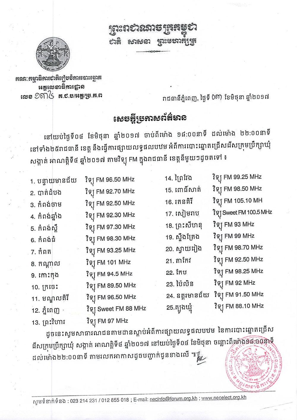 សេចក្ដីប្រកាសព័ត៌មាន លេខ ១៣៤៖ នៅយប់ថ្ងៃទី០៤ ខែមិថុនា ឆ្នាំ២០១៧ ចាប់ពីម៉ោង ១៨: ០០នាទី ដល់ម៉ោង ២២:០០នាទី នៅទាំង២៥រាជធានី ខេត្ត នឹងធ្វើការផ្សាយលទ្ធផលបឋម អំពីការបោះឆ្នោត