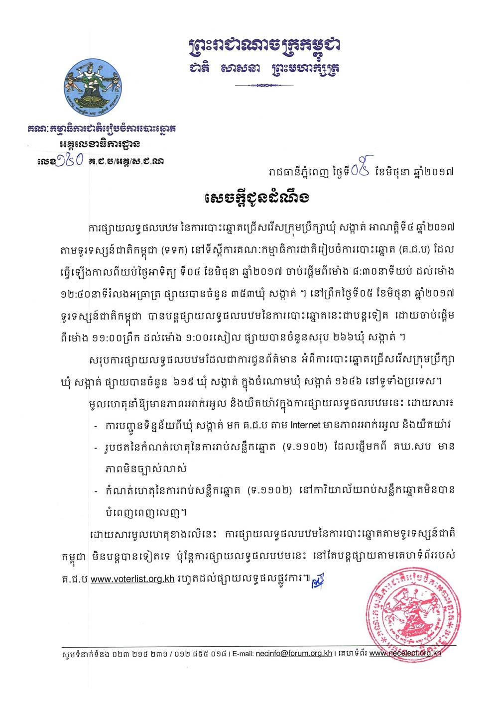 ដោយសារមូលហេតុខាងលើនេះ ការផ្សាយលទ្ធផលបឋមនៃការបោះឆ្នោតតាមទូរទស្សន៍ជាតិកម្ពុជា មិនបន្តបានទៀតទេ ប៉ុន្តែការផ្សាយលទ្ធផលបឋមនេះ នៅតែបន្តផ្សាយតាមគេហទំព័ររបស់ គ.ជ.ប www.voterlist.org.kh រហូតដល់ផ្សាយលទ្ធផលផ្លូវការ៕