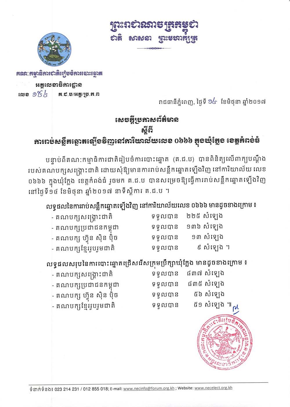 សេចក្ដីប្រកាសព័ត៌មាន លេខ ១៥៤ ស្ដីពីលទ្ធផលនៃការរាប់សន្លឹកឆ្នោតឡើងវិញនៅការិយាល័យលេខ ០៦៦៦ ក្នុងឃុំក្លែង ខេត្តកំពង់ធំ