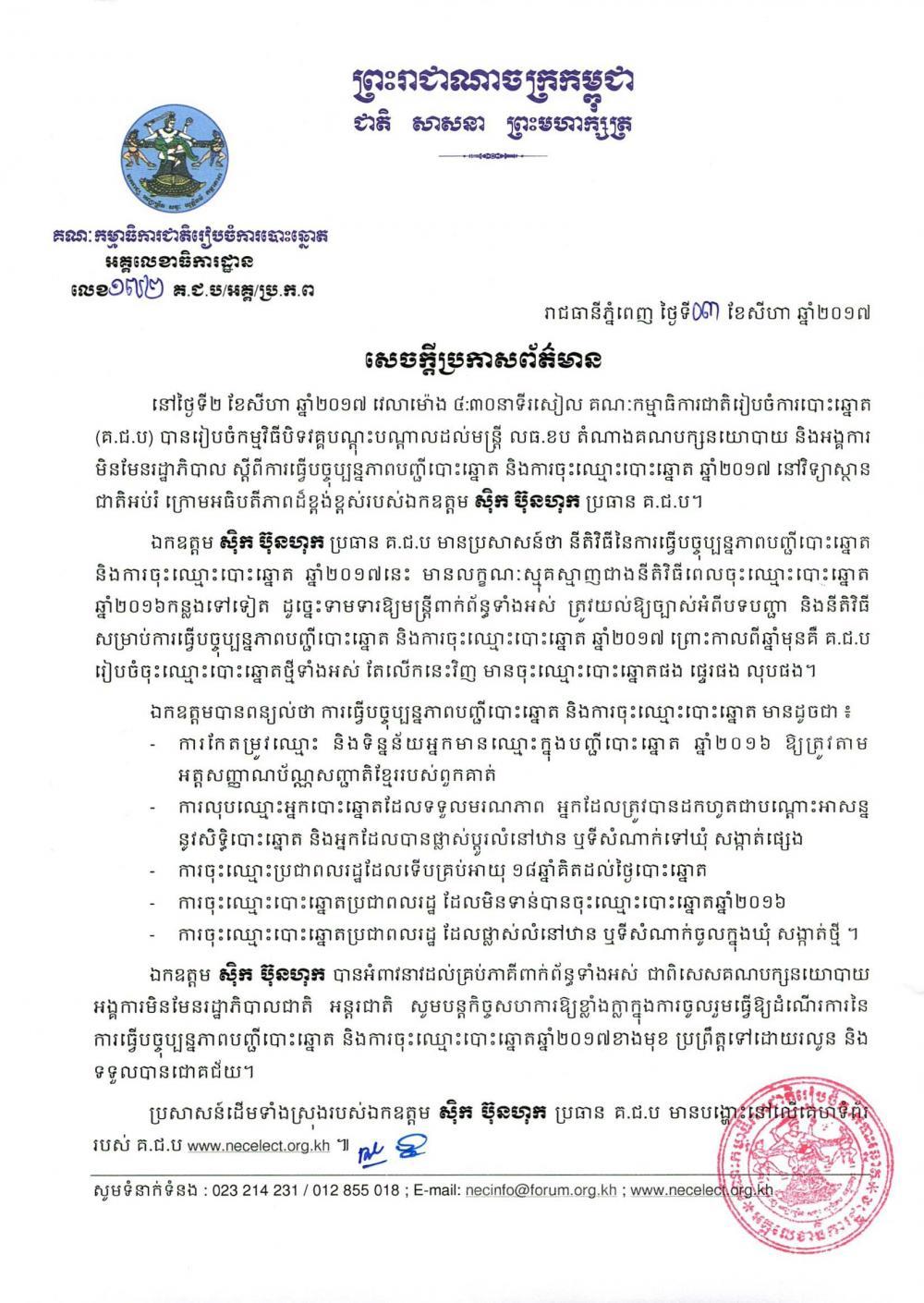 សេចក្ដីប្រកាសព័ត៌មាន លេខ ១៧២៖ គ.ជ.ប បានរៀបចំកម្មវិធីបិទវគ្គបណ្ដុះបណ្ដាលដល់មន្ត្រី លធ.ខប តំណាងគណបក្សនយោបាយ និងអង្គការមិនមែនរដ្ឋាភិបាល ស្ដីពីការធ្វើបច្ចុប្បន្នភាពបញ្ជីបោះឆ្នោត និងការចុះឈ្មោះបោះឆ្នោត ឆ្នាំ២០១៧