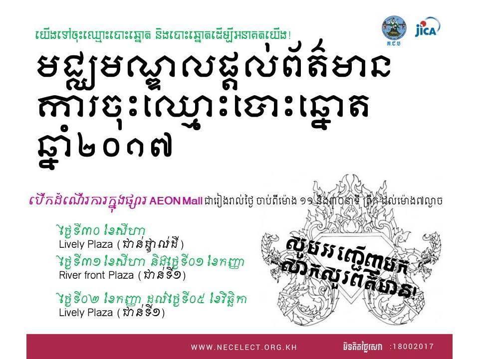 មជ្ឈមណ្ឌលផ្ដល់ព័ត៌មានការចុះឈ្មោះបោះឆ្នោត ឆ្នាំ២០១៧ បើកដំណើរការក្នុងផ្សារ AEON Mall ជារៀងរាល់ថ្ងៃ ចាប់ពីម៉ោង ១១:៣០ នាទីព្រឹកដល់ម៉ោង ៧ល្ងាច