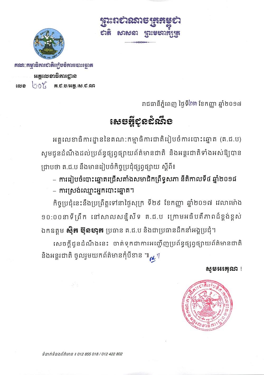 សេចក្ដីជូនដំណឹង លេខ ២០៥៖ នាថ្ងៃសុក្រ ទី២៩ ខែកញ្ញា ឆ្នាំ២០១៧ គ.ជ.ប នឹងមានរៀបចំកិច្ចប្រជុំផ្សព្វផ្សាយ ស្ដីពីការរៀបចំបោះឆ្នោតជ្រើសតាំងសមាជិកព្រឹទ្ធសភា នីតិកាលទី៤ ឆ្នាំ២០១៨ និងការស្រង់ឈ្មោះអ្នកបោះឆ្នោត
