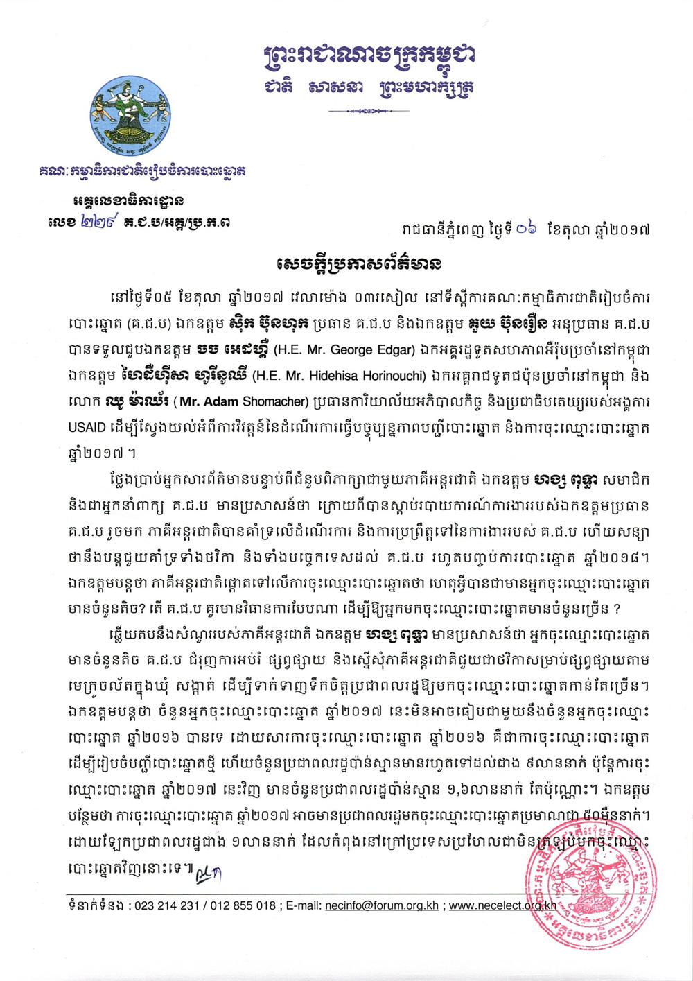 នៅថ្ងៃទី០៥ ខែតុលា ឆ្នាំ២០១៧ វេលាម៉ោង ០៣រសៀល នៅទីស្តីការគណៈកម្មាធិការជាតិរៀបចំការបោះឆ្នោត (គ.ជ.ប) ឯកឧត្តម ស៊ិក ប៊ុនហុក ប្រធាន គ.ជ.ប និងឯកឧត្តម គួយ ប៊ុនរឿន អនុប្រធាន គ.ជ.ប បានទទួលជួបឯកឧត្តម ចច អេដហ្គឺ (H.E. Mr. George Edgar) ឯកអគ្គរដ្ឋទូតសហភាពអឺរ៉ុបប្រចាំនៅកម្ពុជា ឯកឧត្តម ហៃដឺហ៊ីសា ហូរីនូឈី (H.E. Mr. Hidehisa Horinouchi) ឯកអគ្គរាជទូតជប៉ុនប្រចាំនៅកម្ពុជា និងលោក ឈូ ម៉ាឈ័រ (Mr. Adam Shomacher) ប្រធានការិយាល័យអភិបាលកិច្ច និងប្រជាធិបតេយ្យរបស់អង្គការ USAID ដើម្បីស្វែងយល់អំពីការវិវត្តន៍នៃដំណើរការធ្វើបច្ចុប្បន្នភាពបញ្ជីបោះឆ្នោត និងការចុះឈ្មោះបោះឆ្នោត ឆ្នាំ២០១៧ ។