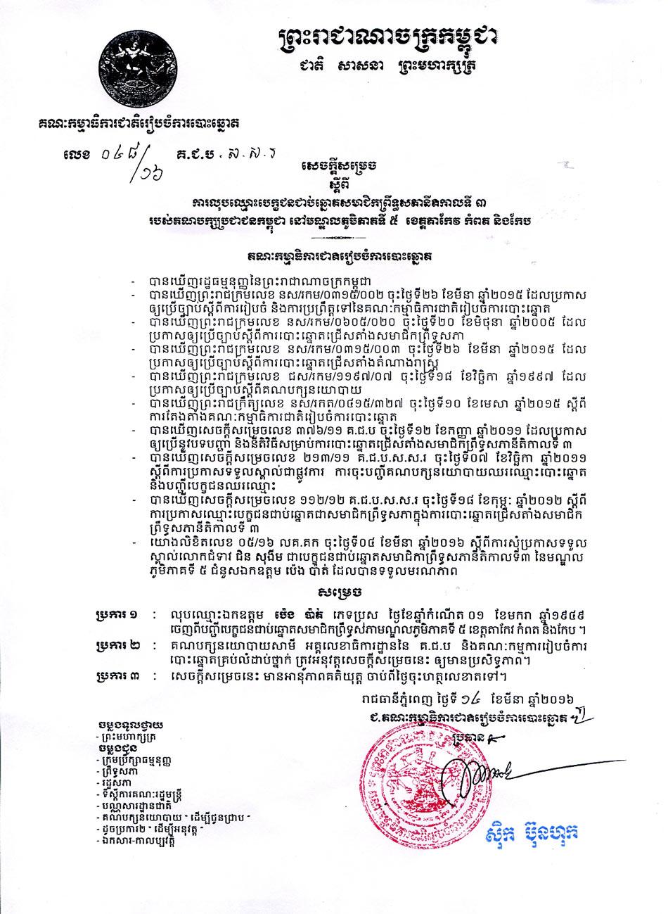 សេចក្ដីសម្រេចស្ដីពីការលុបឈ្មោះបេក្ខជនជាប់ឆ្នោតសមាជិកព្រឹទ្ធសភានីតិកាលទី៣ របស់គណបក្សប្រជាជនកម្ពុជា នៅមណ្ឌលភូមិភាគទី៥ ខេត្តតាកែវ កំពត និងកែប