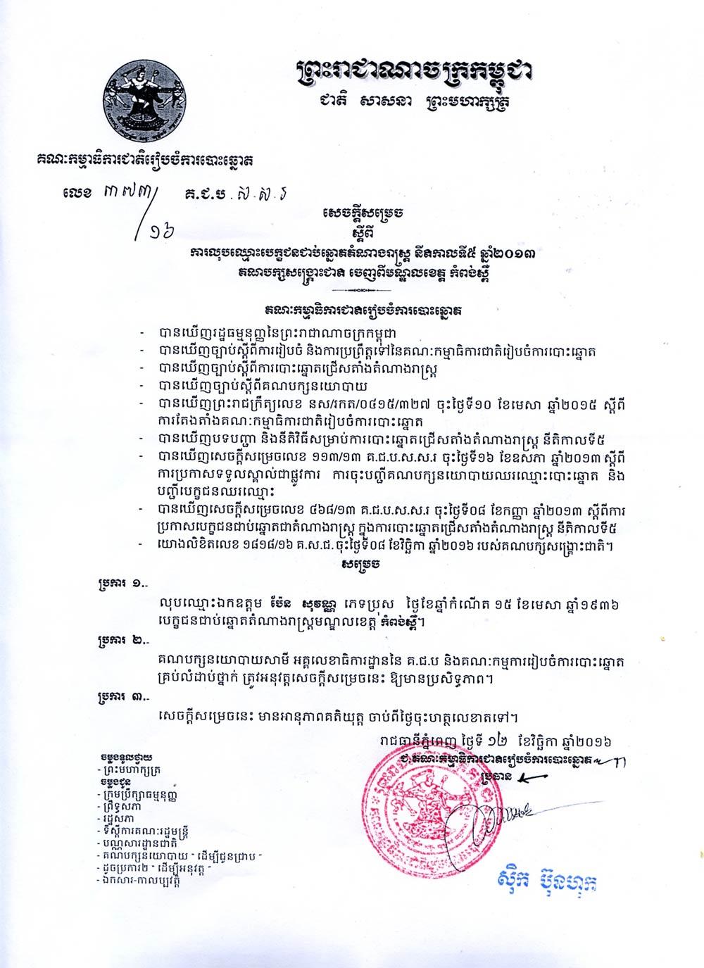សេចក្ដីសម្រេច ស្ដីពីការលុបឈ្មោះបេក្ខជនជាប់ឆ្នោតតំណាងរាស្រ្ត នីតិកាលទី៥ ឆ្នាំ២០១៣ គណបក្សសង្រ្គោះជាតិ ចេញពីមណ្ឌលខេត្ត កំពង់ស្ពឺ