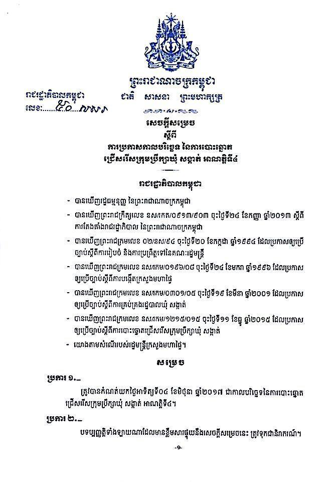 សេចក្តីសម្រេចស្តីពីការប្រកាសកាលបរិច្ឆេទ នៃការបោះឆ្នោតជ្រើសរើសក្រុមប្រឹក្សាឃុំ សង្កាត់ អាណត្តិទី៤