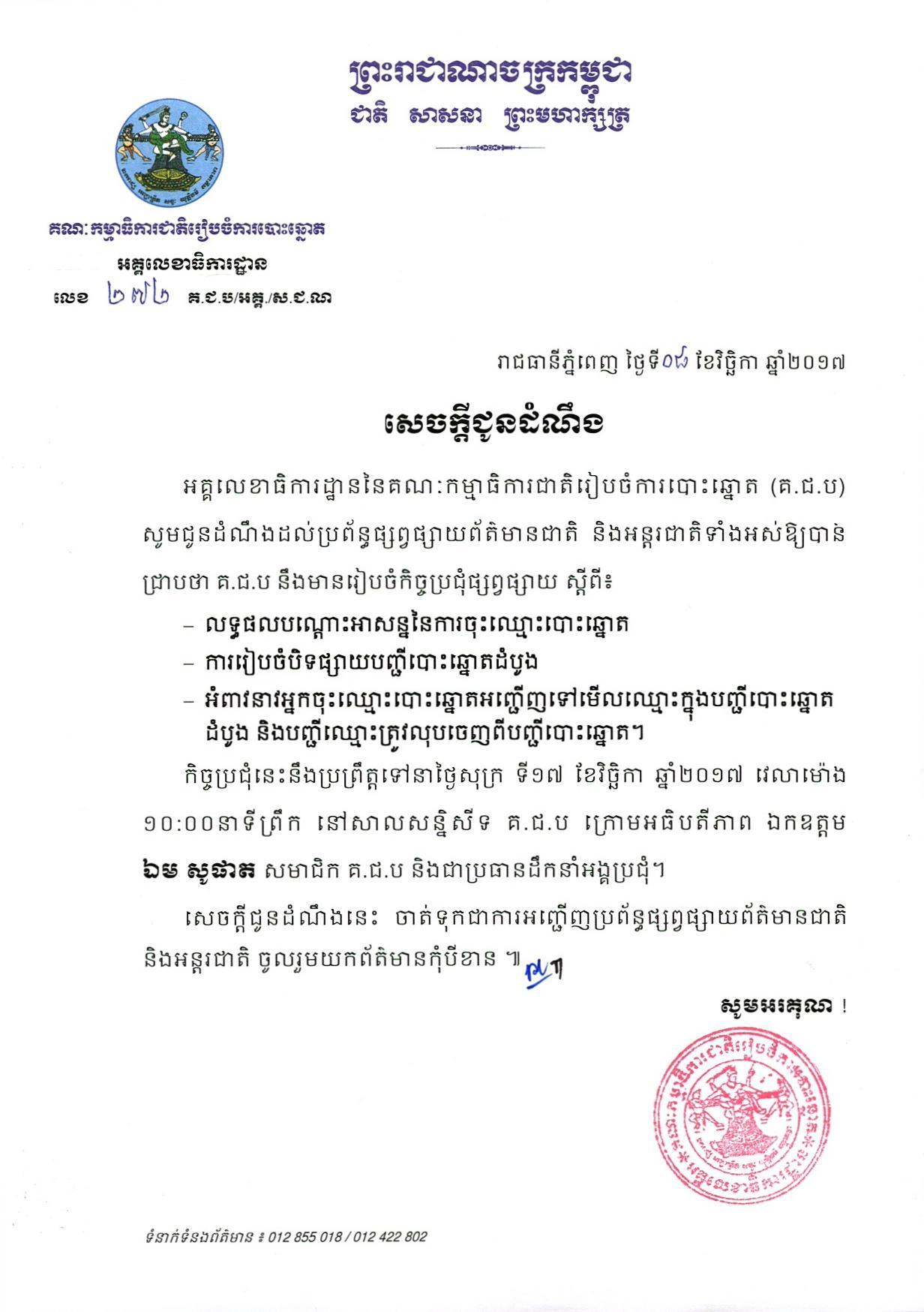 គ.ជ.ប នឹងមានរៀបចំកិច្ចប្រជុំផ្សព្វផ្សាយ ស្ដីពី៖លទ្ធផលបណ្ដោះអាសន្ននៃការចុះឈ្មោះបោះឆ្នោត - ការរៀបចំបិទផ្សាយបញ្ជីបោះឆ្នោត - អំពាវនាវអ្នកចុះឈ្មោះបោះឆ្នោតអញ្ជើញទៅមើលឈ្មោះក្នុងបញ្ជីបោះឆ្នោតដំបូង