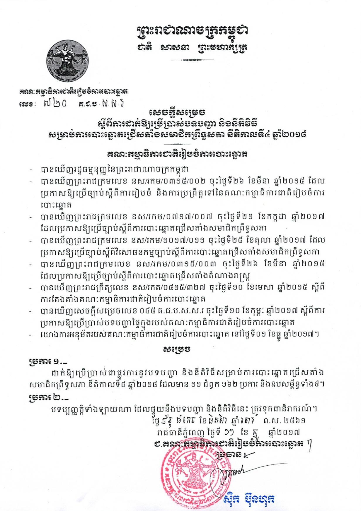 សេចក្ដីសម្រេច លេខ ៧២០ ស្ដីពីការដាក់ឱ្យប្រើប្រាស់បទបញ្ជា និងនីតិវិធី សម្រាប់ការបោះឆ្នោតជ្រើសតាំងសមាជិកព្រឹទ្ធសភា នីតិកាលទី៤ ឆ្នាំ២០១៨