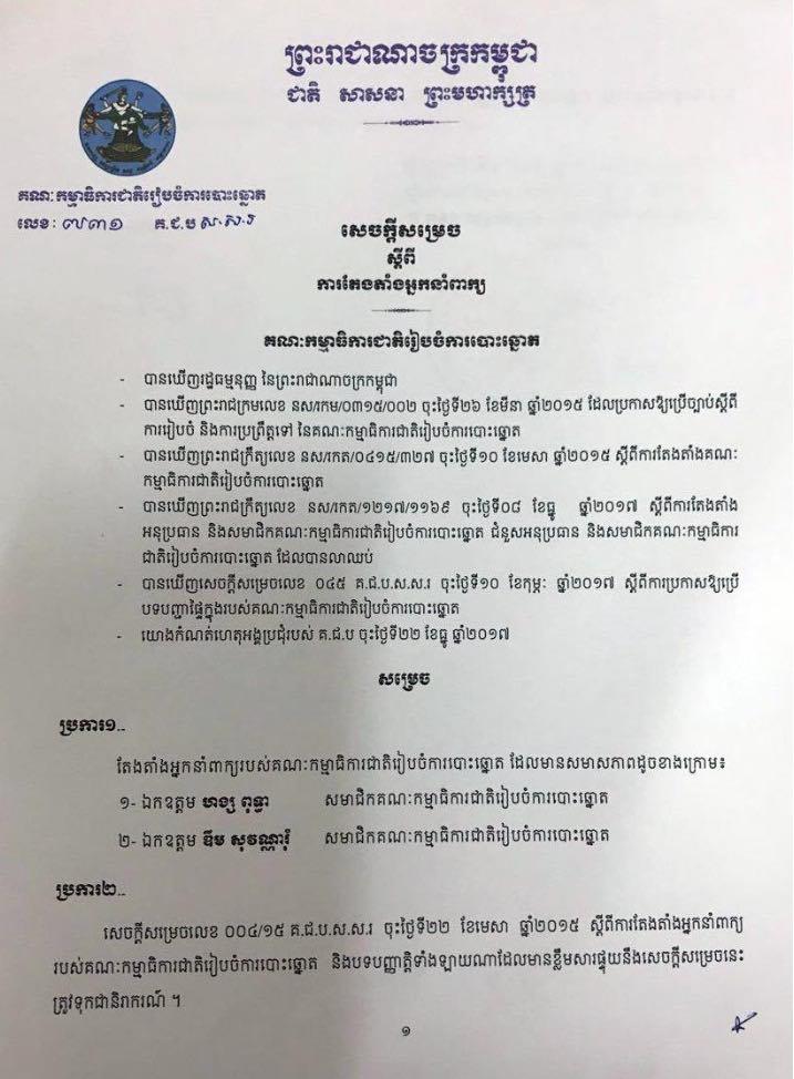 សេចក្ដីសម្រេច ស្ដីពីការតែងតាំងអ្នកនាំពាក្យ គ.ជ.ប (ឯកឧត្ដម ហង្ស ពុទ្ធា និងឯកឧត្ដម ឌឹម សុវណ្ណារុំ)