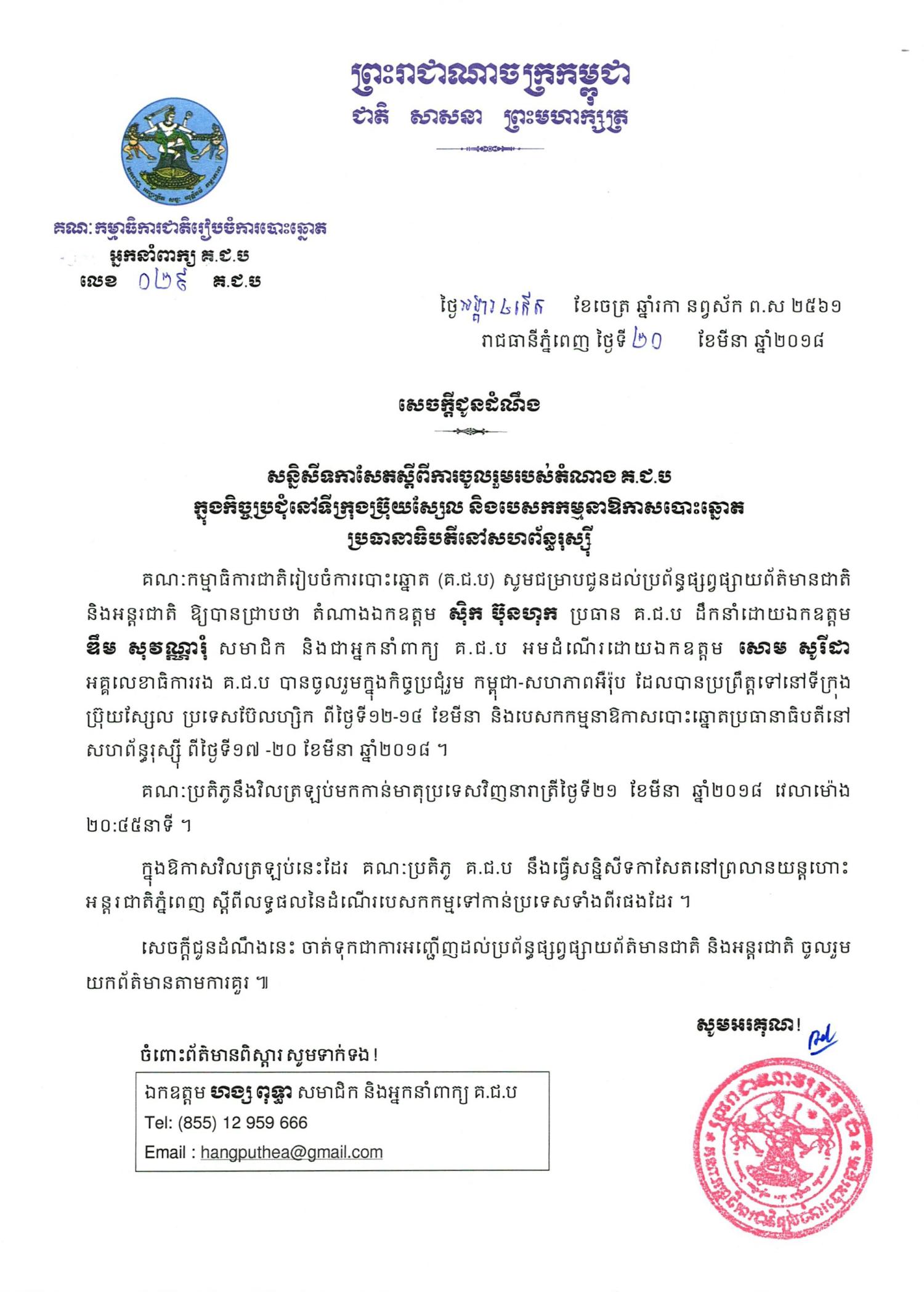 សេចក្ដីជូនដំណឹង លេខ ០២៩៖ សន្និសីទកាសែតស្ដីពីការចូលរួមរបស់តំណាង គ.ជ.ប ក្នុងកិច្ចប្រជុំនៅទីក្រុងប្រ៊ុយស្សែល និងបេសកកម្មនាឱកាសបោះឆ្នោតប្រធានាធិបតីនៅសហព័ន្ធរុស្ស៊ី