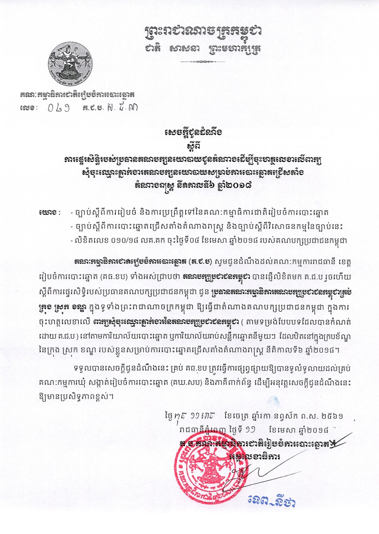 សេចក្ដីជូនដំណឹង លេខ ០៤១ ស្ដីពីការផ្ទេរសិទ្ធិរបស់ប្រធានគណបក្សនយោបាយជូនតំណាងដើម្បីចុះហត្ថលេខាលើពាក្យសុំចុះឈ្មោះភ្នាក់ងារគណបក្សនយោបាយសម្រាប់ការបោះឆ្នោតជ្រើសតាំងតំណាងរាស្ត្រ នីតិកាលទី៦ ឆ្នាំ២០១៨ (គណបក្សប្រជាជនកម្ពុជា)