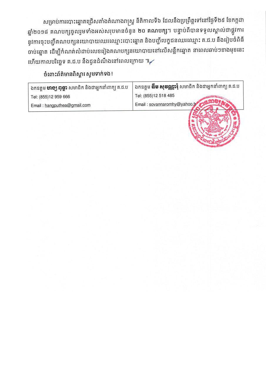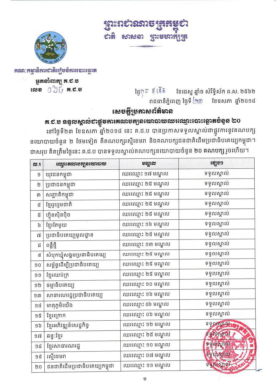 សេចក្ដីប្រកាសព័ត៌មាន លេខ ០៦៨៖ គ.ជ.ប ទទួលស្គាល់ជាផ្លូវការគណបក្សនយោបាយឈរឈ្មោះបោះឆ្នោតចំនួន ២០
