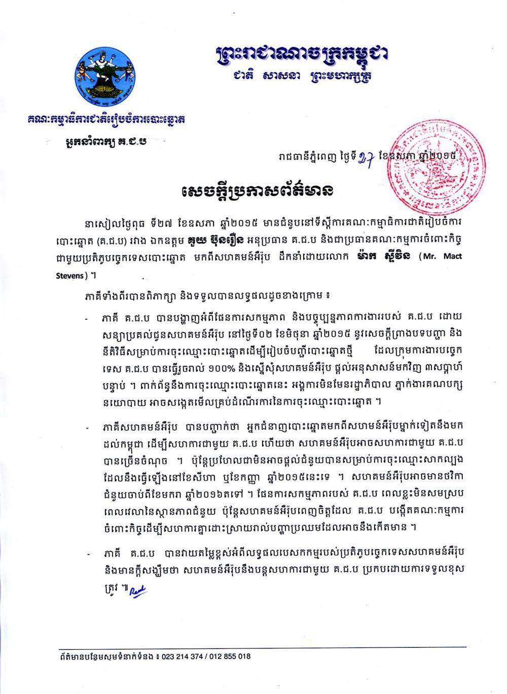 ជំនួបរវាងអនុប្រធាន គ.ជ.ប និងប្រតិភូបច្ចេកទេសបោះឆ្នោត មកពីសហគមន៍អឺរ៉ុប ថ្ងៃទី២៧ ខែឧសភា ឆ្នាំ២០១៥