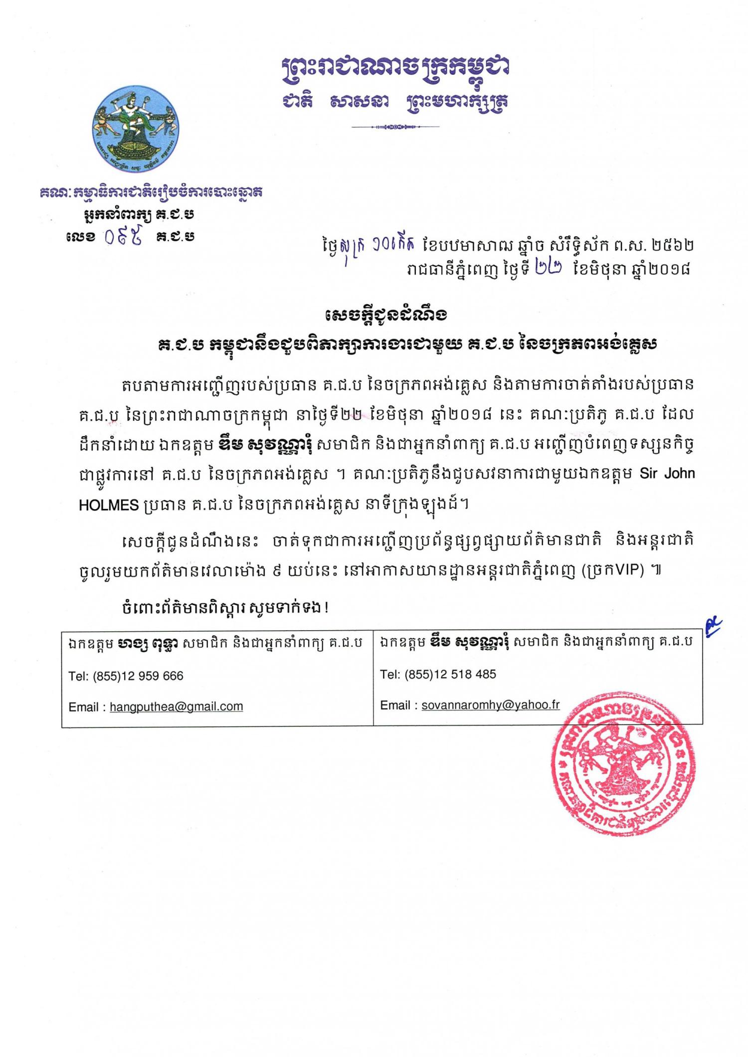 សេចក្តីជូនដំណឹង លេខ ០៩៥ ៖ គ.ជ.ប កម្ពុជានឹងជួបពិភាក្សាការងារជាមួយ គ.ជ.ប នៃចក្រភពអង់គ្លេស
