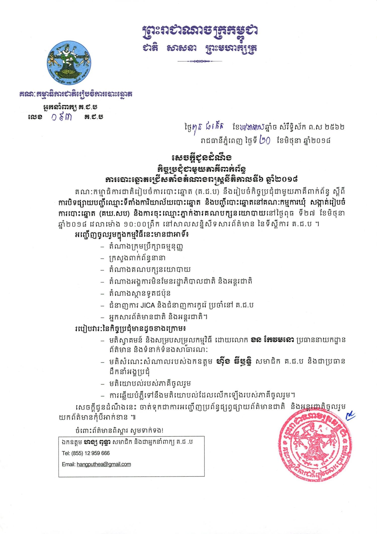 សេចក្ដីជូនដំណឹង លេខ ០៩៣៖ កិច្ចប្រជុំជាមួយភាគីពាក់ព័ន្ធការបោះឆ្នោតជ្រើសតាំងតំណាងរាស្ត្រ នីតិកាលទី៦ ឆ្នាំ២០១៨