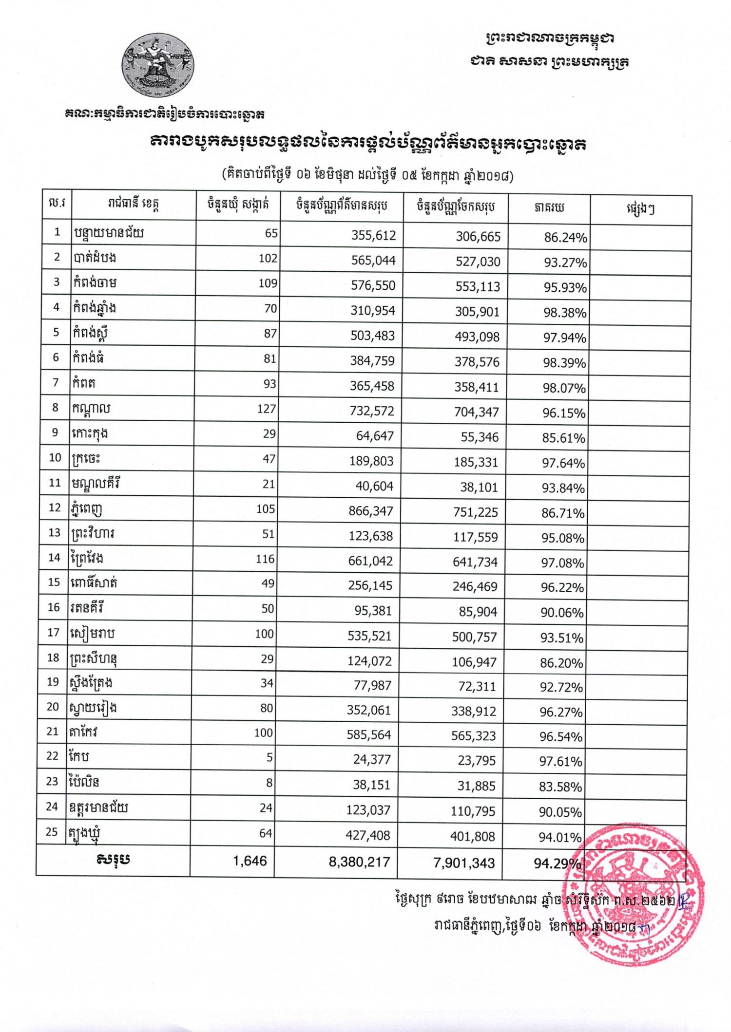 តារាងបូកសរុបលទ្ធផលនៃការផ្ដល់ប័ណ្ណព័ត៌មានអ្នកបោះឆ្នោត គិតពីថ្ងៃទី០៦ ដល់ថ្ងៃទី១៥ ខែកក្កដា ឆ្នាំ២០១៨
