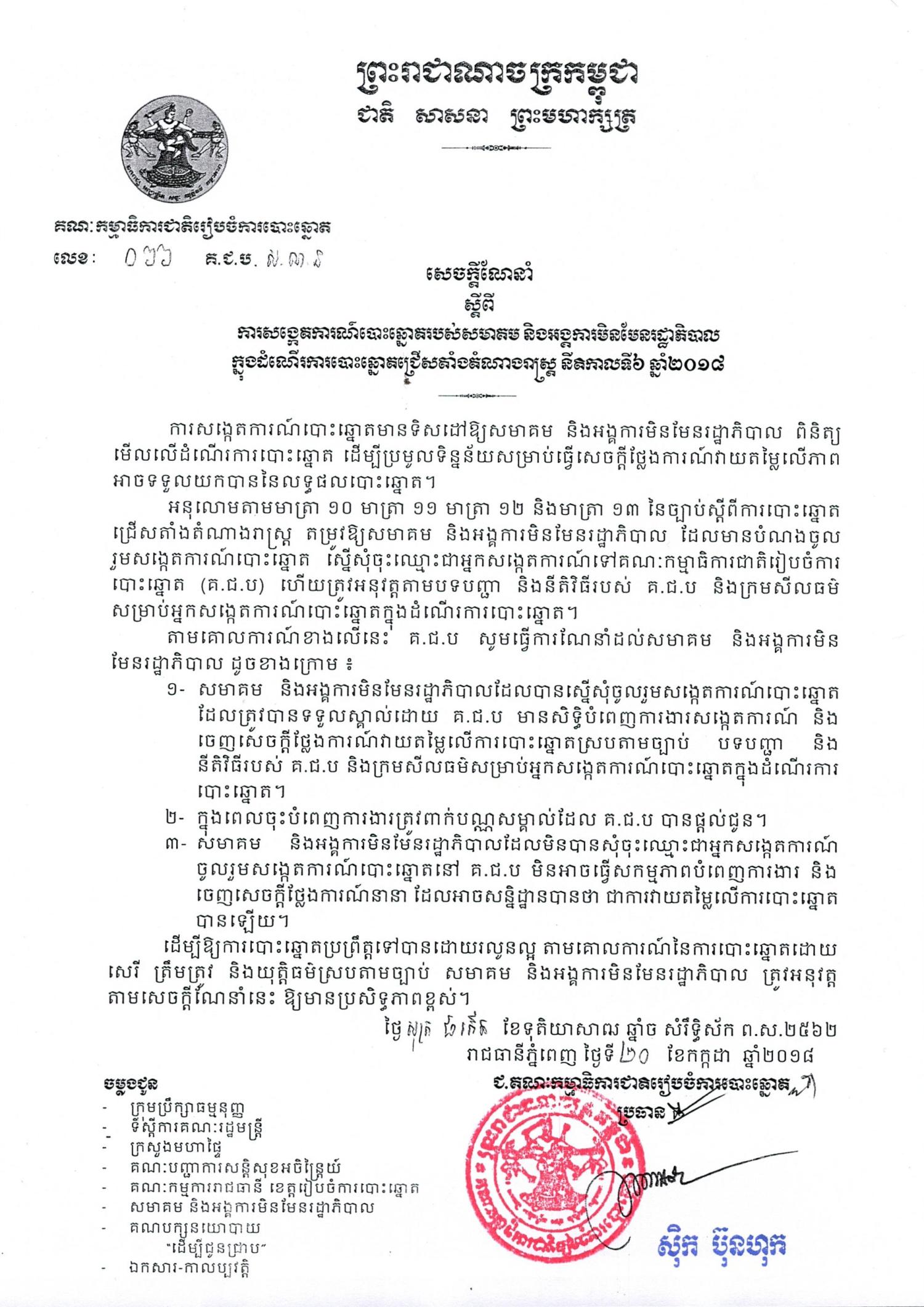 សេចក្ដីណែនាំ លេខ ៦៦ ស្ដីពីការសង្កេតការណ៍បោះឆ្នោតរបស់សមាគម និងអង្គការមិនមែនរដ្ឋាភិបាល ក្នុងដំណើរការបោះឆ្នោតជ្រើសតាំងតំណាងរាស្ត្រ នីតិកាលទី៦ ឆ្នាំ២០១៨