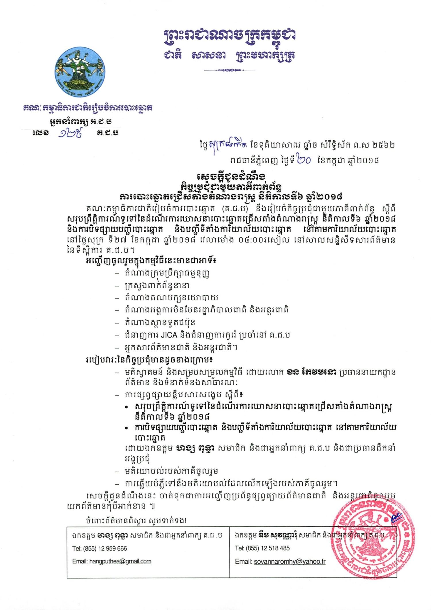 សេចក្ដីជូនដំណឹង លេខ ១២៥៖ កិច្ចប្រជុំជាមួយភាគីពាក់ព័ន្ធការបោះឆ្នោតជ្រើសតាំងតំណាងរាស្ត្រ នីតិកាលទី៦ ឆ្នាំ២០១៨