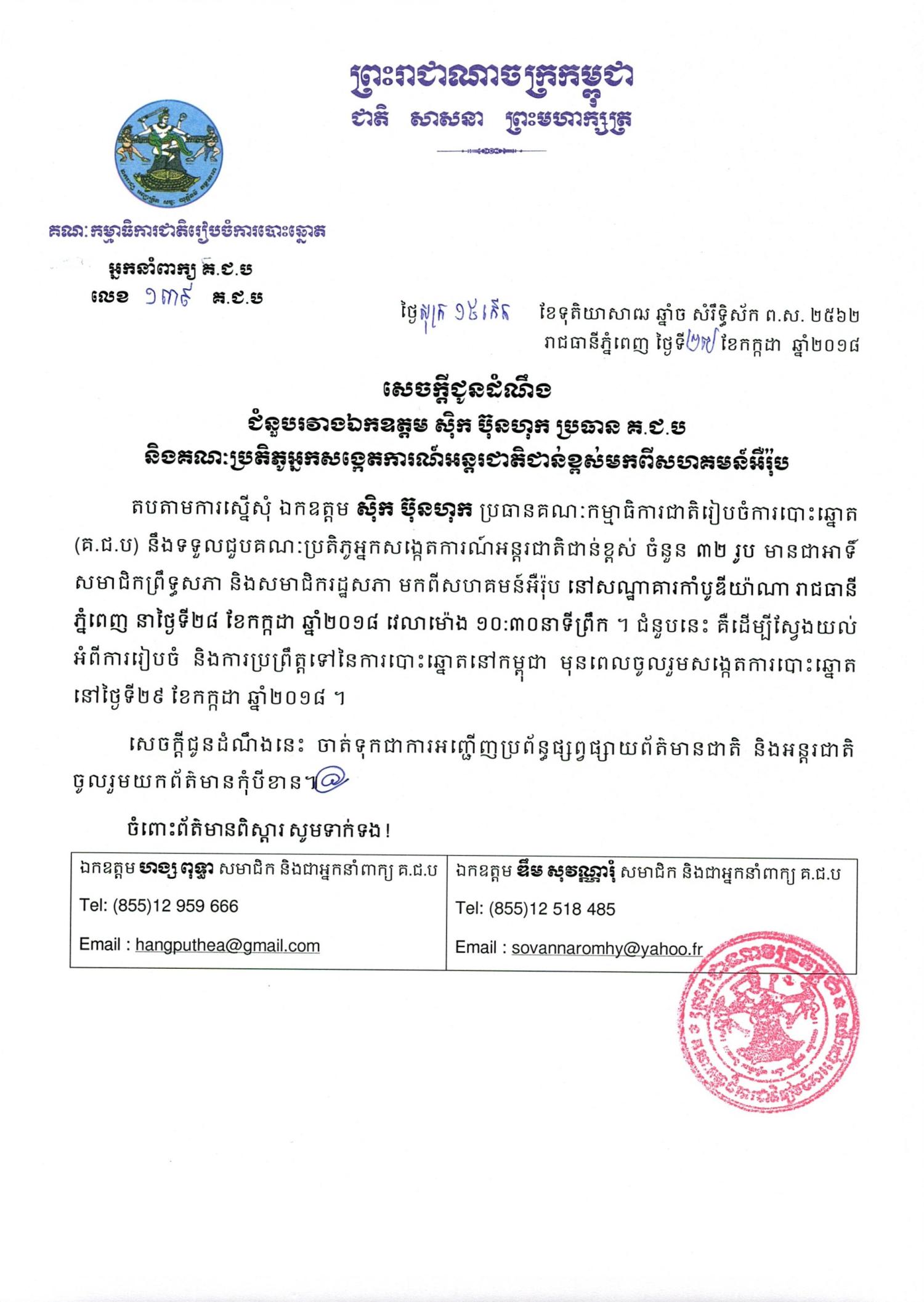សេចក្ដីជូនដំណឹង លេខ ១៣៩៖ ជំនួបរវាងឯកឧត្ដម ស៊ិក ប៊ុនហុក ប្រធាន គ.ជ.ប និងគណៈប្រតិភូអ្នកសង្កេតការណ៍អន្តរជាតិជាន់ខ្ពស់មកពីសហគមន៍អឺរ៉ុប