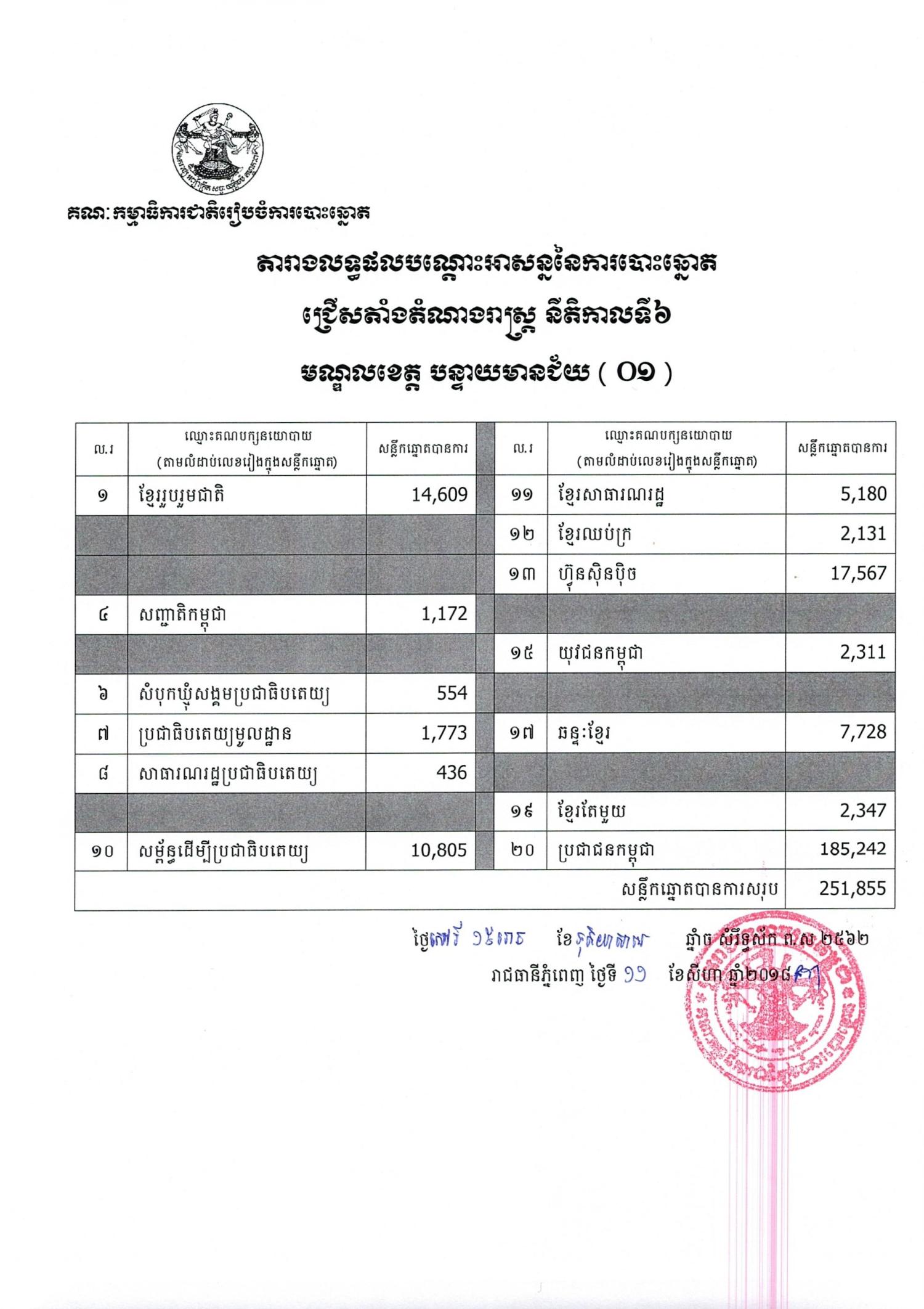 តារាងលទ្ធផលបណ្ដោះអាសន្ននៃការបោះឆ្នោតជ្រើសតាំងតំណាងរាស្ត្រ នីតិកាលទី៦ មណ្ឌល ខេត្ត បន្ទាយមានជ័យ (០១)