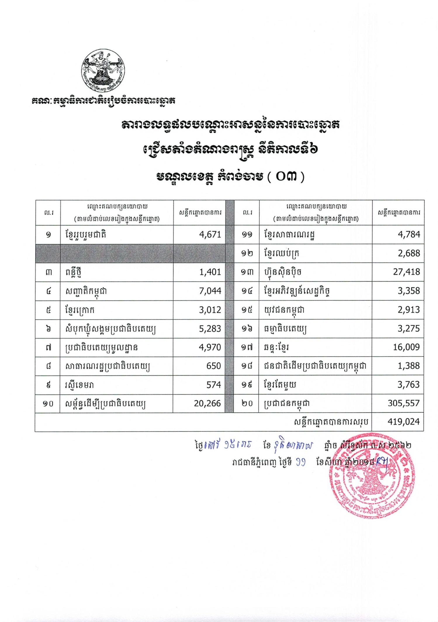 តារាងលទ្ធផលបណ្ដោះអាសន្ននៃការបោះឆ្នោតជ្រើសតាំងតំណាងរាស្ត្រ នីតិកាលទី៦ មណ្ឌល ខេត្ត កំពង់ចាម (០៣)