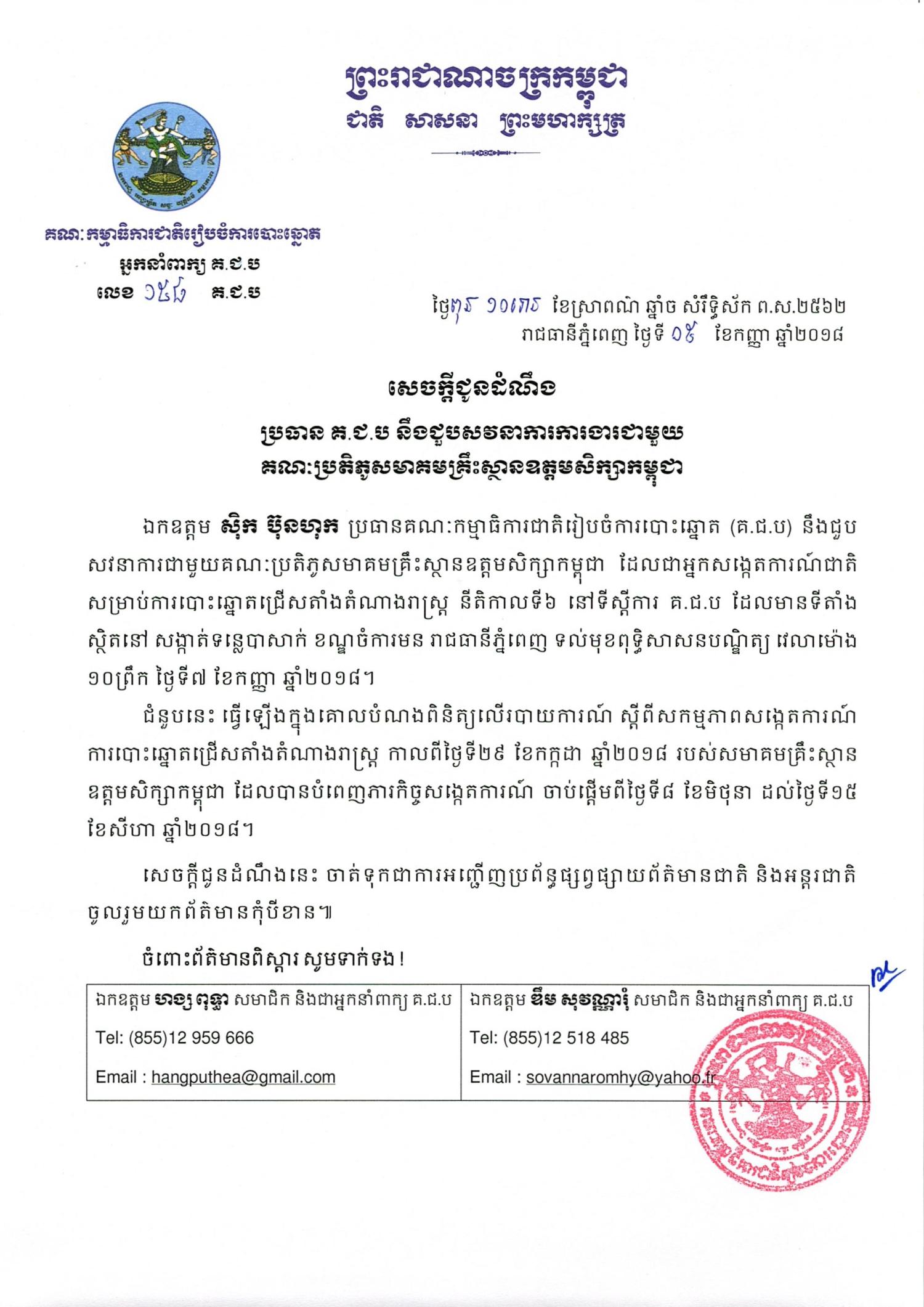 សេចក្ដីជូនដំណឹង លេខ ១៥៨៖ ប្រធាន គ.ជ.ប នឹងជួបសវនាការការងារជាមួយគណៈប្រតិភូសមាគមគ្រឹះស្ថានឧត្ដមសិក្សាកម្ពុជា