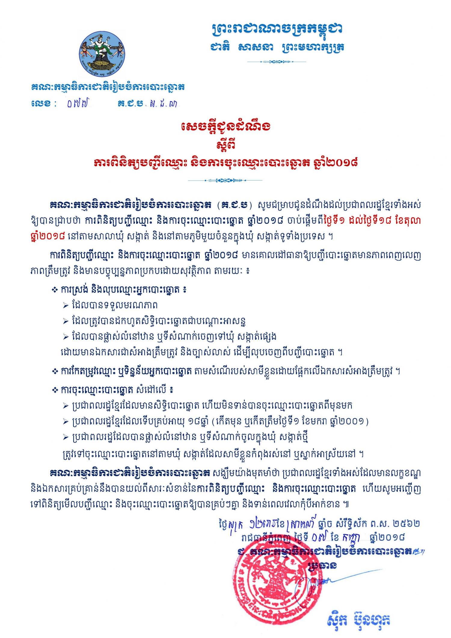 សេចក្ដីជូនដំណឹង លេខ ០៧៧ ស្ដីពីការពិនិត្យបញ្ជីឈ្មោះ និងការចុះឈ្មោះបោះឆ្នោត ឆ្នាំ២០១៨