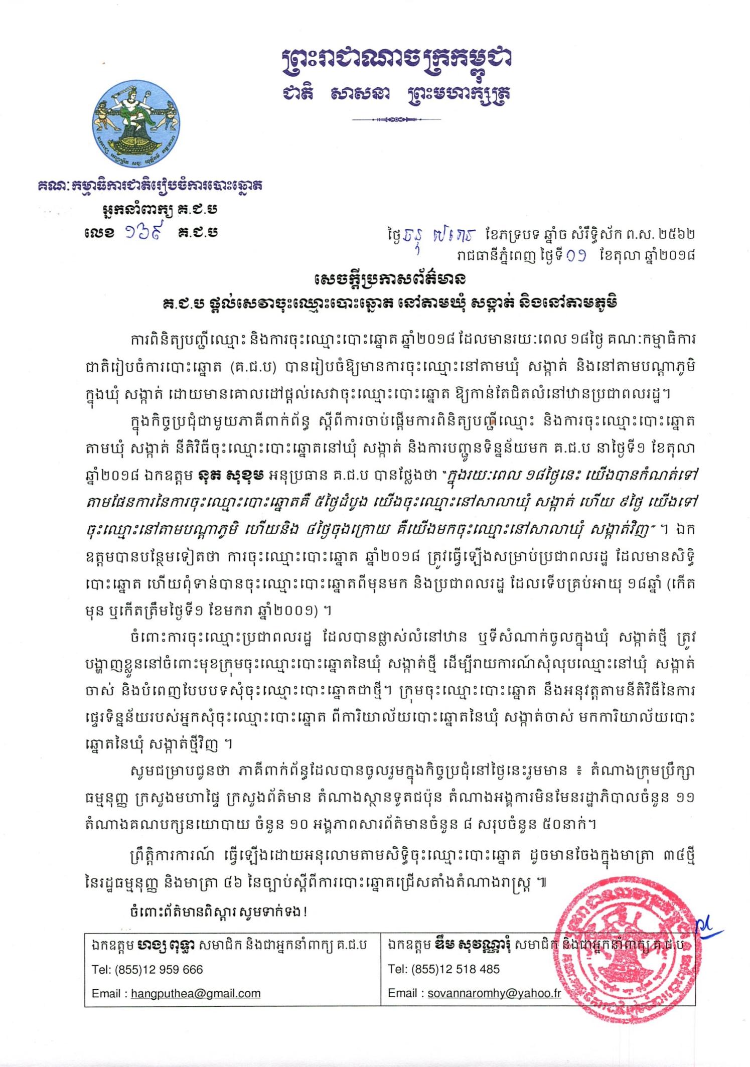សេចក្ដីប្រកាសព័ត៌មាន លេខ ១៦៩៖ គ.ជ.ប ផ្ដល់សេវាចុះឈ្មោះបោះឆ្នោត នៅតាមឃុំ សង្កាត់ និងតាមភូមិ