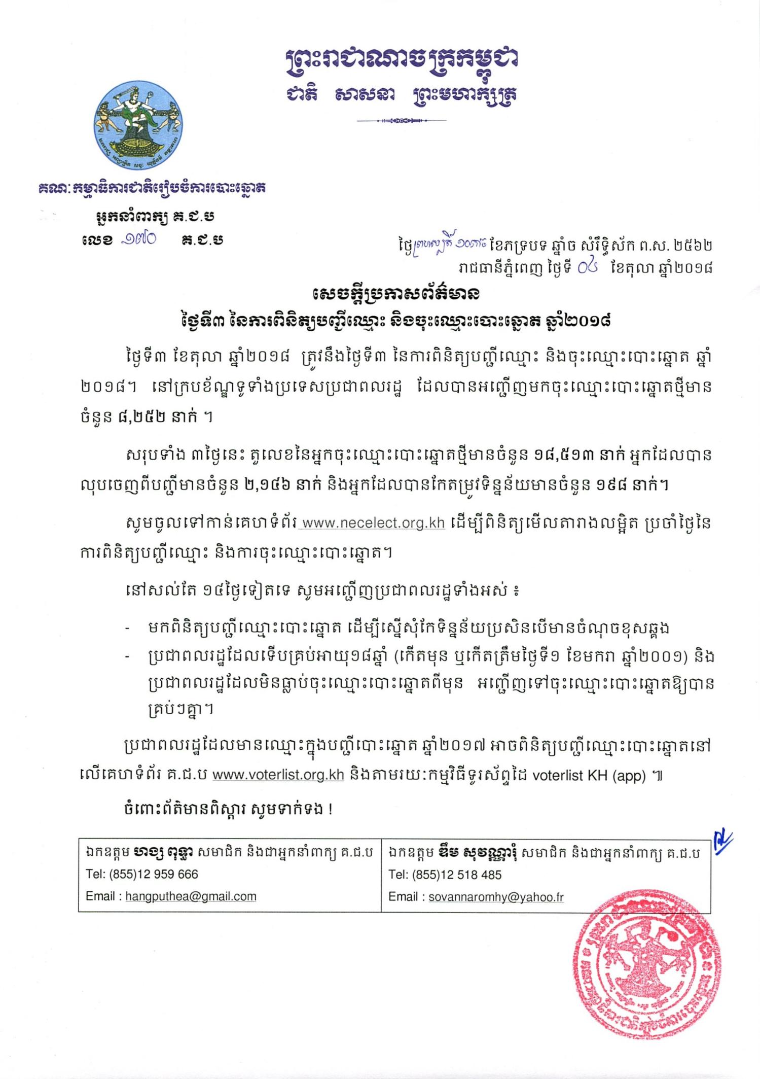 សេចក្ដីប្រកាសព័ត៌មាន លេខ ១៧០៖ ថ្ងៃទី៣ នៃការពិនិត្យបញ្ជីឈ្មោះ និងចុះឈ្មោះបោះឆ្នោត ឆ្នាំ២០១៨