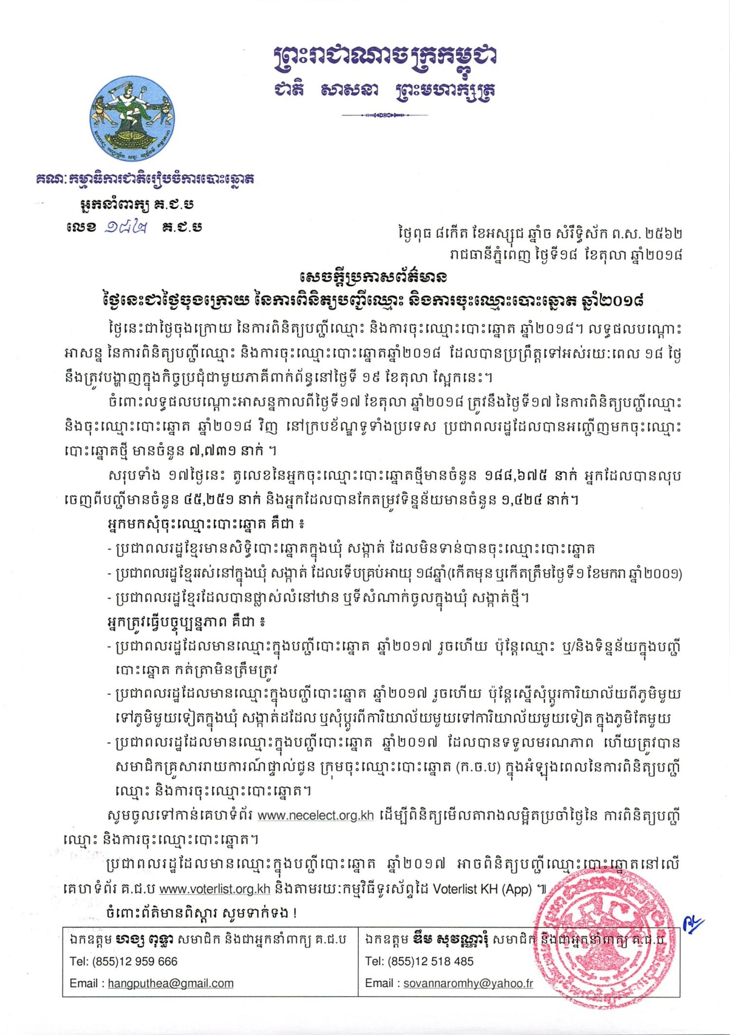សេចក្ដីប្រកាសព័ត៌មាន លេខ ១៨២៖ ថ្ងៃនេះជាថ្ងៃចុងក្រោយ នៃការពិនិត្យបញ្ជីឈ្មោះ និងចុះឈ្មោះបោះឆ្នោត ឆ្នាំ២០១៨