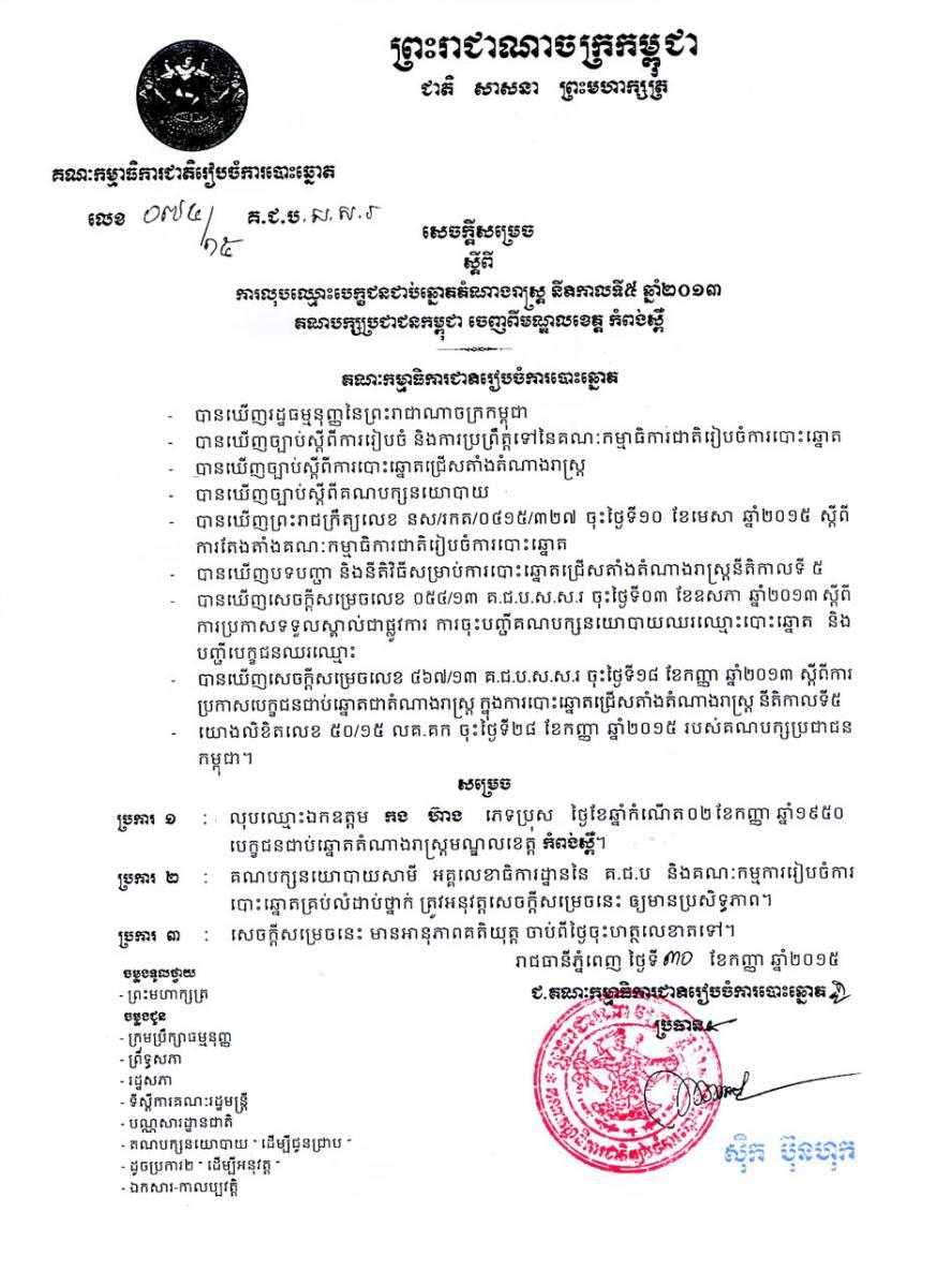 សេចក្ដីសម្រេចស្ដីពីការលុបឈ្មោះបេក្ខជនជាប់ឆ្នោតតំណាងរាស្រ្ត នីតិកាលទី៥ ឆ្នាំ២០១៣ គណបក្សប្រជាជនកម្ពុជា ចេញពីមណ្ឌលខេត្ត កំពង់ស្ពឺ