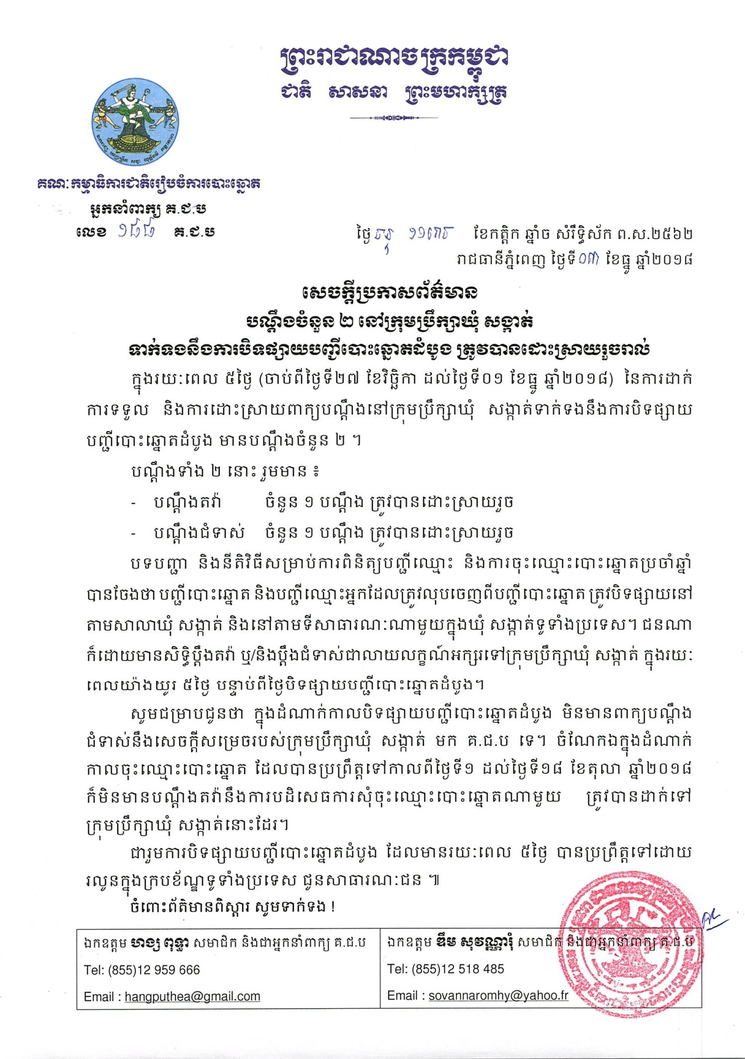សេចក្ដីប្រកាសព័ត៌មាន លេខ ១៨៨៖ បណ្ដឹងចំនួន ២ នៅក្រុមប្រឹក្សាឃុំ សង្កាត់ ទាក់ទងនឹងការបិទផ្សាយបញ្ជីបោះឆ្នោតដំបូង ត្រូវបានដោះស្រាយរួចរាល់