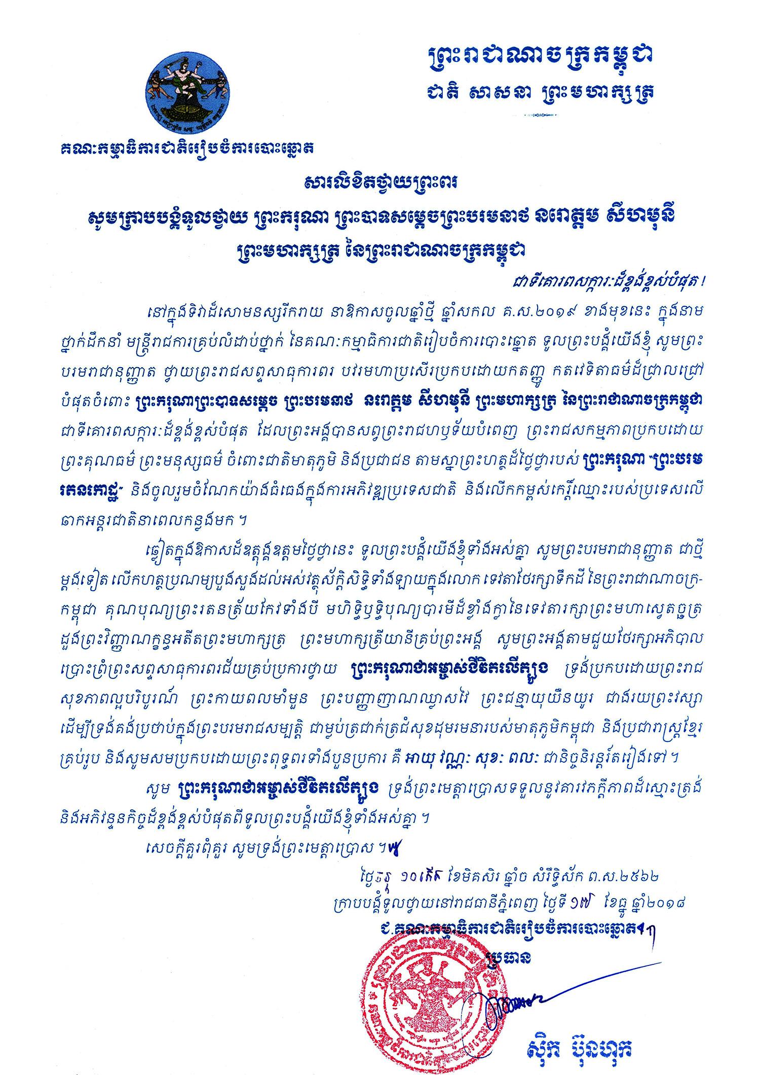 សារលិខិតថ្វាយព្រះពរ សូមក្រាបបង្គំទូលថ្វាយ ព្រះករុណា ព្រះបាទសម្តេចព្រះបរមនាថ នរោត្តម សីហមុនី ព្រះមហាក្សត្រ នៃព្រះរាជាណាចក្រកម្ពុជា