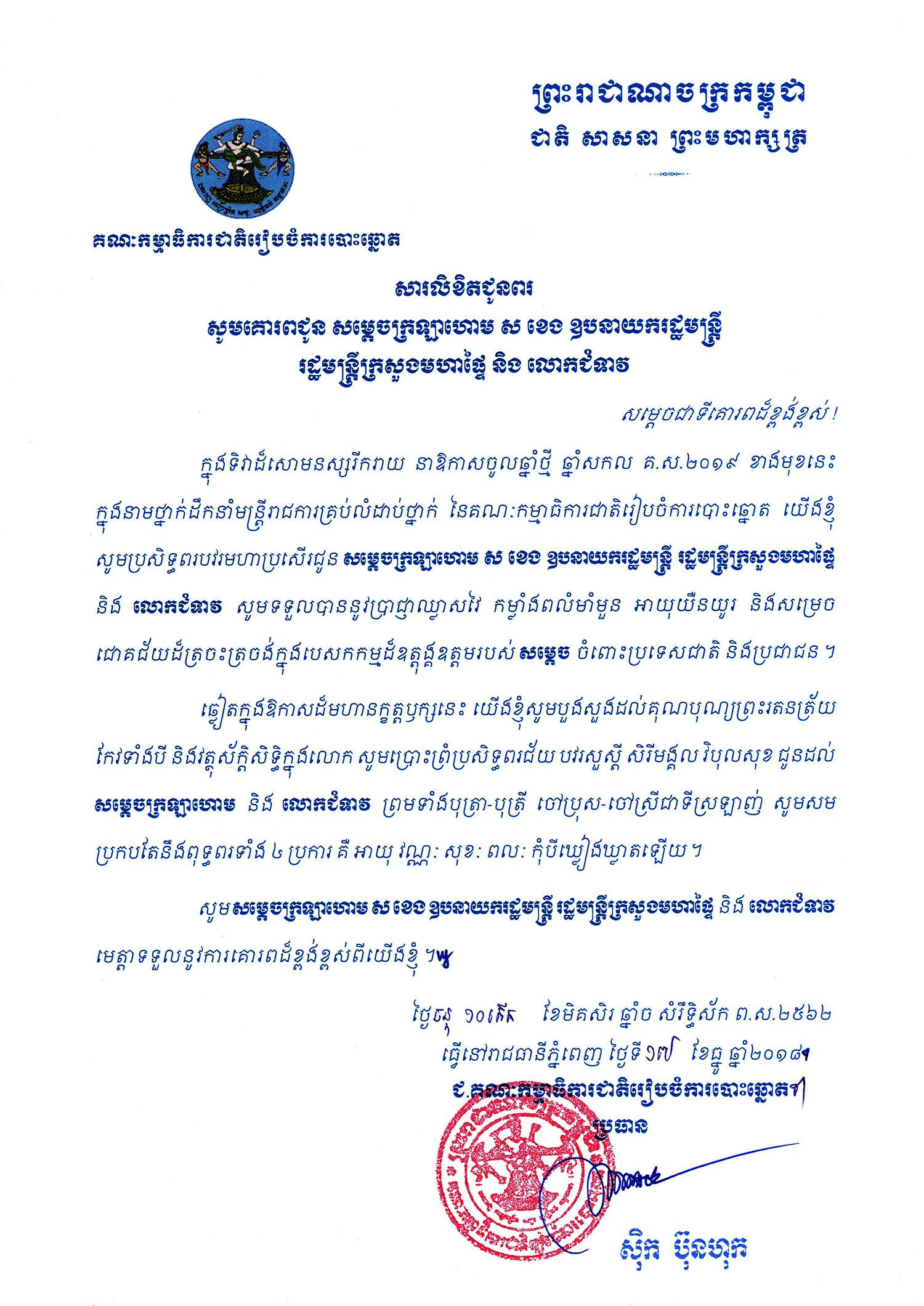 សារលិខិតជូនពរ សូមគោរពជូន សម្តេចក្រឡាហោម ស ខេង ឧបនាយករដ្ឋមន្ត្រី រដ្ឋមន្ត្រីក្រសួងមហាផ្ទៃ និងលោកជំទាវ
