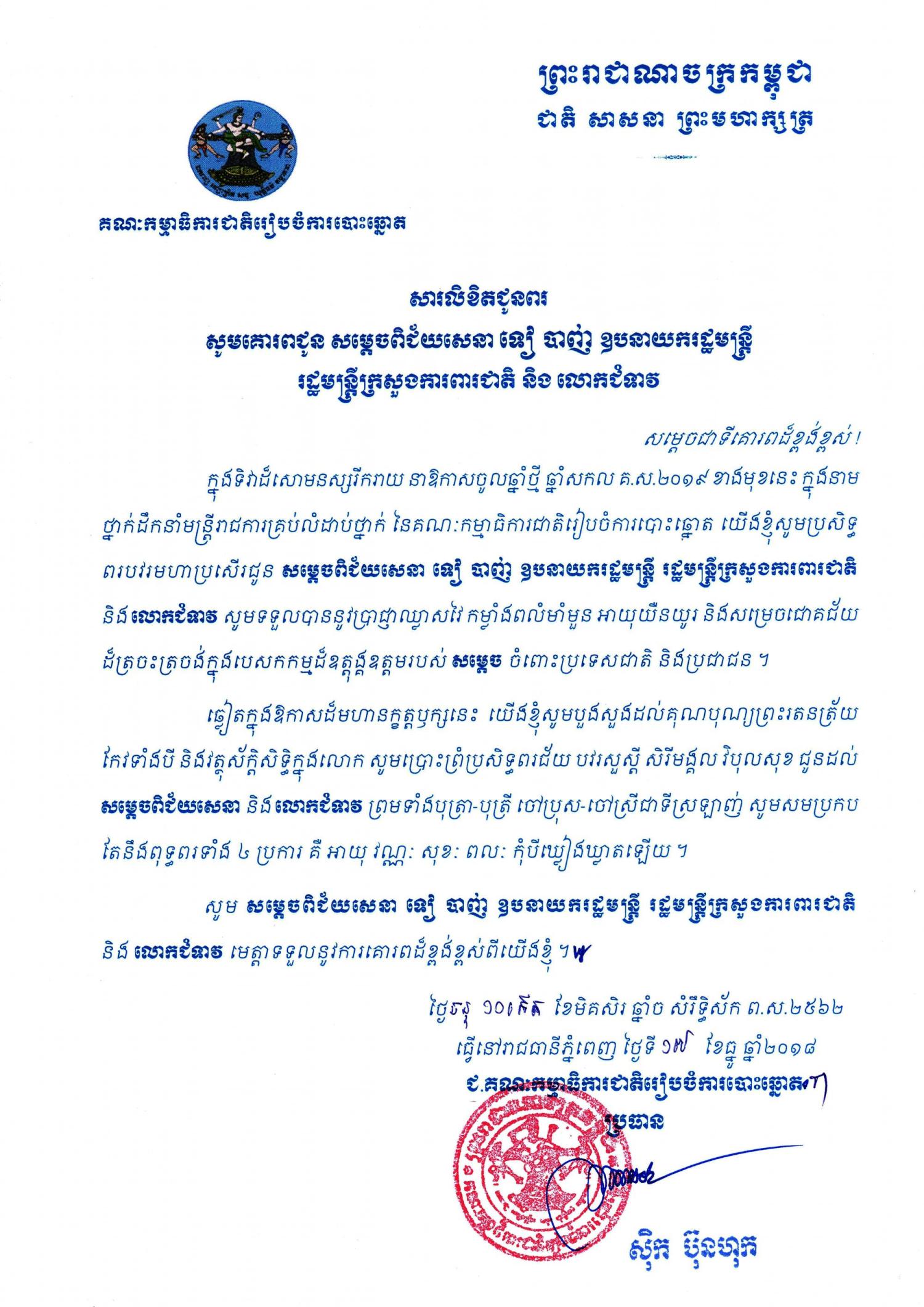 សារលិខិតជូនពរ សូមគោរពជូន សម្តេចពិជ័យសេនា ទៀ បាញ់ ឧបនាយករដ្ឋមន្រ្តី រដ្ឋមន្រ្តីក្រសួងការពារជាតិ និងលោកជំទាវ